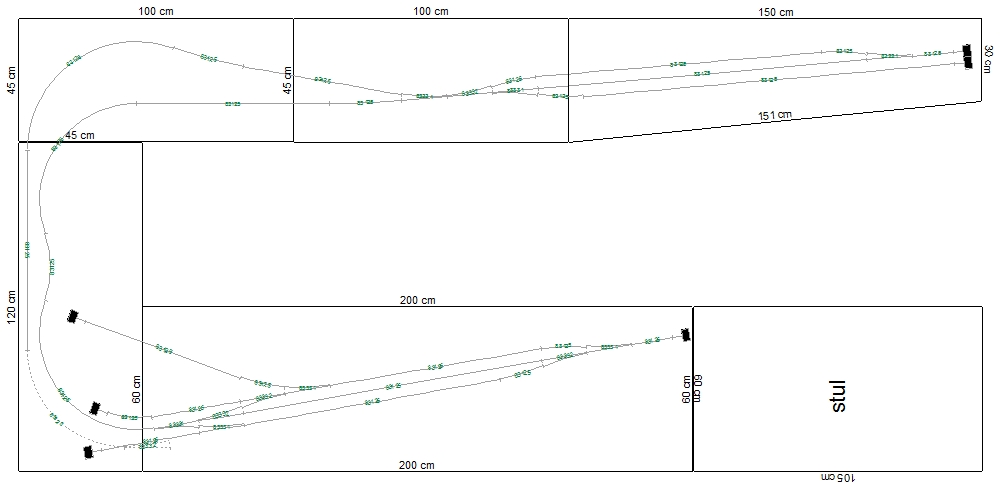 No, jak jsem psal, ram 60 x 200 je hotovy. Vyhazovat ho nebudu. Jedine, ze by ho nekdo chtel. A stul ma taky sve pevne rozmery. Nedovedu si predstavit jeho kraceni ci vedeni trati po nem. Servisni kolej nepotrebuji. Navic na stole bude monitor, pod stolem PC.
