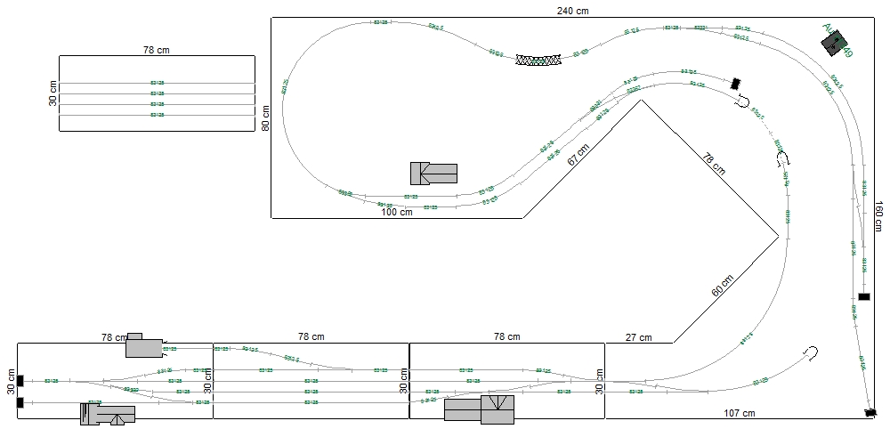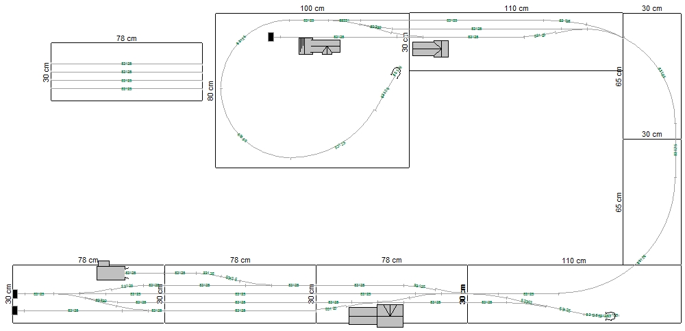 Tak po přečtení jednoho tématu jsem se odhodlal k úpravě úvraťové stanice na Velkou Kraš. Velká Kraš je čtyřech modulech, tři stabilní, jeden vyndávací. Při plné délce má 1. staniční kolej délku 230 cm, což je víc, než po přepočtu ve skutečnosti (cca 200 metrů, t.j. 1,7 m v TT); bez tohoto dílu má 160 cm. Tento díl možná nebude nutný, ale zvažuji, že by mohl sloužit v domácím provozu jako součát SN. Dále jsem upravil koncovou stanici, vzhledem k přemístění výtopny do Kraše. Tato stanice se mi ale i nadále nelíbí a tudíž bude asi vypadat úplně jinak. Jak, to netuším. Za koncovou stanicí pokračuje krátká vlečka, jejíž účel mi taky zatím nebyl můzou svěřen. Co je problém, že se mi stoupání dostalo v obou tratích do ostřejších hodnot a to přes 3 cm/m a to se mi nelíbí. Uvažuji nad kompletním překopáním vedení tratí, ale chybí mi nápady. Tak aspoň tu Kraš pro domácí modulovku. Výhybky jsou zatím použity upravené EW2. Jo, šířka modulů je 30 cm, přesto se budu snažit zachovat normované rozhraní. Pokud bychom se s dalšími dvěmi panelákovými kolegy rozhodli pro šířku modulů 40 cm, budu muset udělat redukční moduly na každý konec stanice. Nebo tam bude prostě chod. Bohužel, mé moduly širší být nemohou.