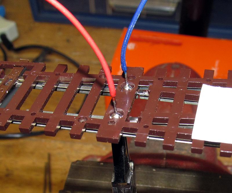Potenciální slabina všech vyhýbek Roco jsou kloubové jazyky a kontakt v nich, když se koleje různě barví patinují atd. Řeším to tak že každý jazyk má připájený extra drátek k napájení. Je to náročný na vhodný postup, k čepu je totiž připájený i jazyk vybroušený z kolejnice. Potenciálně se to může rozpájet, nebo příliš připáct. Na fotce je vyhýbka Rocoline - jazyky jsou naprosto identické s Geoline. Postup můžu podrobně popsat. Pájím to bez jakýhkoliv sraček, kyselin a vodiček, jen pájka a tavidlo co je uvnitř.