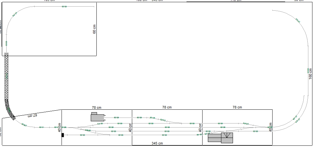 Potom mě napadlo, že bych mohl udělat pospojování malých kolejišťátek, jako tady kdosi vytvořil v TRS (omlouvám se, nevím už kdo to byl...). To se ale zase neshoduje s mými představami o provozu, který by měl být trochu pestřejší, než 810 s nákladním vozem. Dále mě napadlo vzít už výše zmiňovanou Dolní Lhotu a místo do koncové stanice vést trať podél stěny na úzkém panelu, kde by byla koncová. Dokonce jsem měl v myšlenkách tuto koncovou vymyšlenou jako úvraťovou s tím, že by trať objela zpět celou místnost a na druhé straně "panelu" by byla teprve koncová.