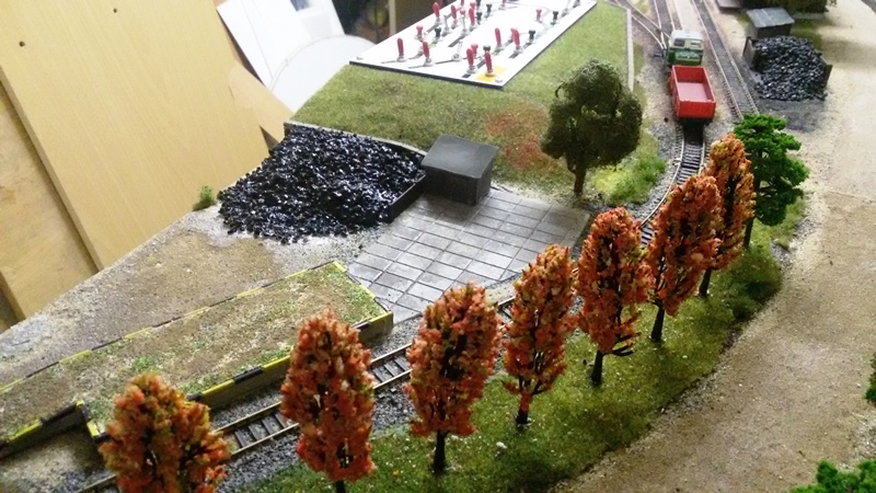 Terén se na přístavku zvedá pouze vpravém zadním rohu. Důvodem je kulisa vpravo od strážního domku za tovární zdí. Když jsem ji udělal, vypadal ten rovný roh za ní tak nějak divně. Tak jsem jej také zvedl a nyní to vypadá, jako když vlak vjíždí do zářezu mezi skalami :-)