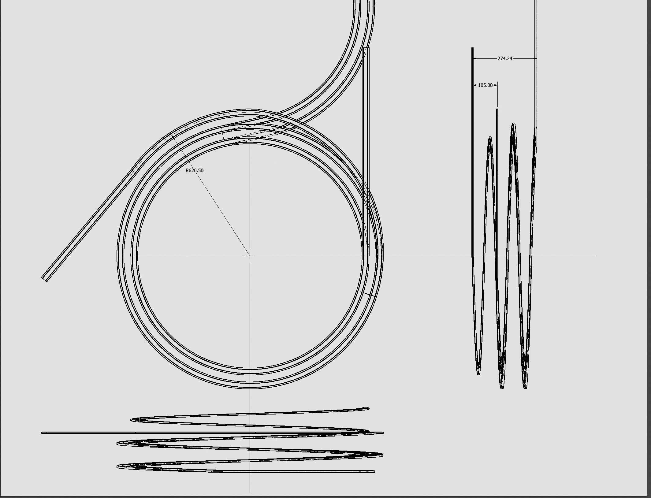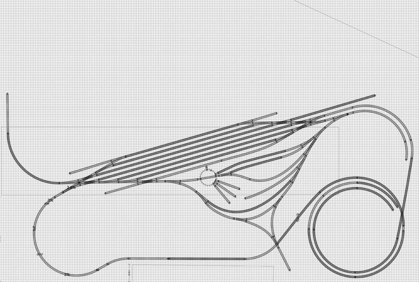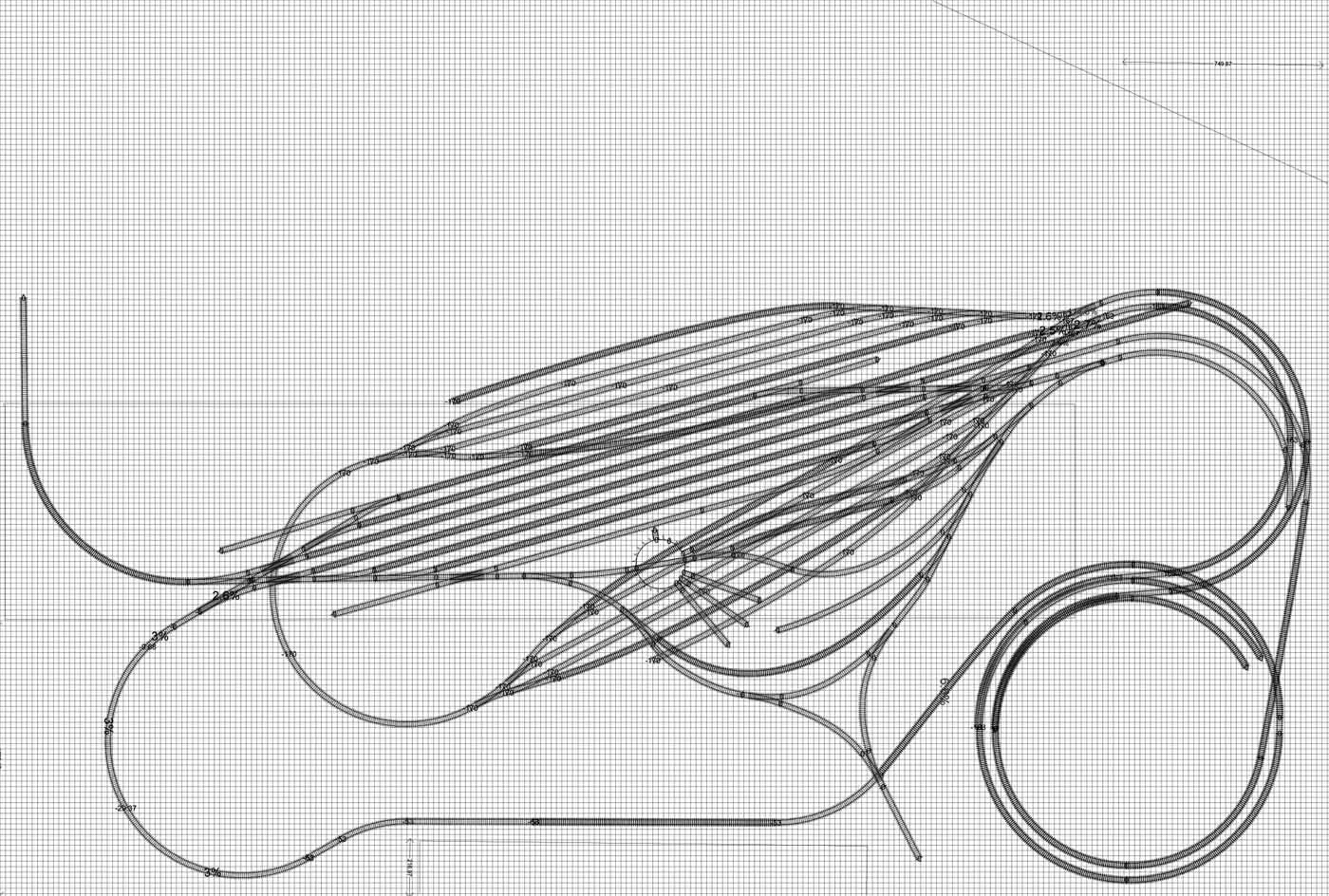 Milane, myslím si že u toho připojení k tobogánu chyba není. Tobogán klesá 100 mm na otáčku. Nazveme si "L" trať vycházejí z levého zhlaví a "P" z pravého. L má poloměr 560 a P 500 mm. Na tobogánu, v místě kde L kříží P, je L o 100 mm níže než P, takže ji podchází. L přichází do toho místa v rovině, Aby nekolidovala s L o patro níže má ta přicházející L větší poloměr - 620 mm. SN jsem uvažoval o 3 otačky, tedy 300 mm pod úrovní nádraží.
