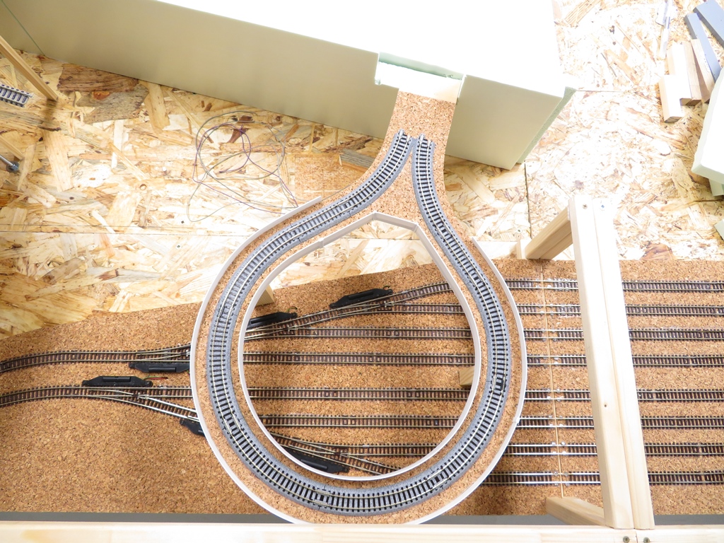 Začínám práce na krajním segmentu. Nakonec jsem viadukt přesunul v programu víc do středu "města" a upravil vratnou smyčku pro otáčení souprav. Její výhybku jsem dal skryté části. Vzhledem k tomu, že celá smyčka je maximálně vedena při okraji kvůli přístupu by to neměl být problém.