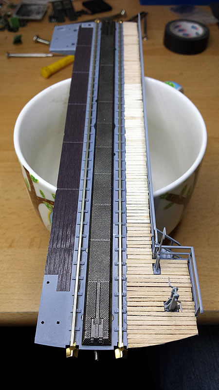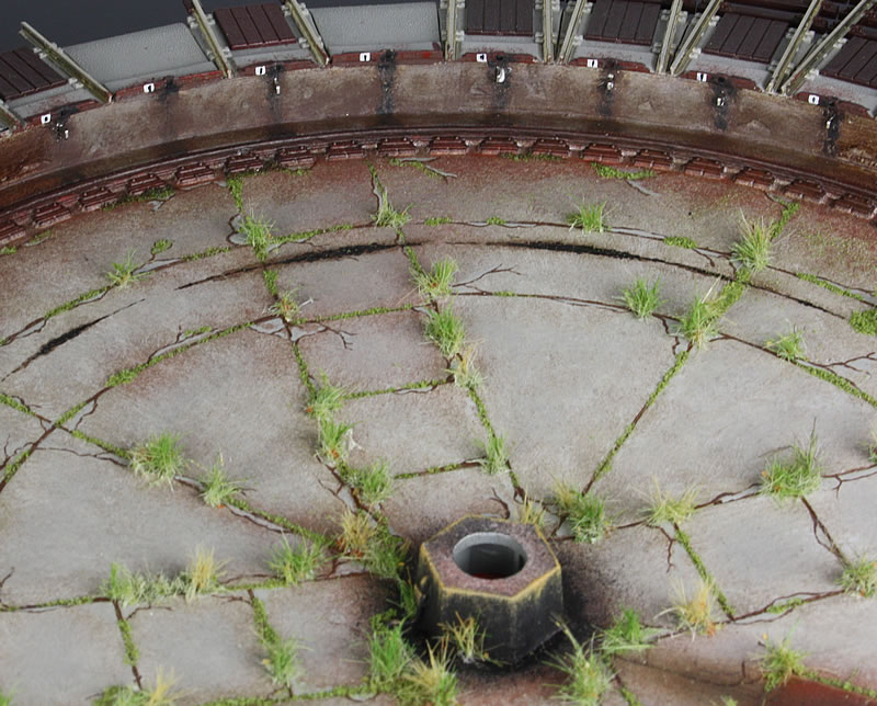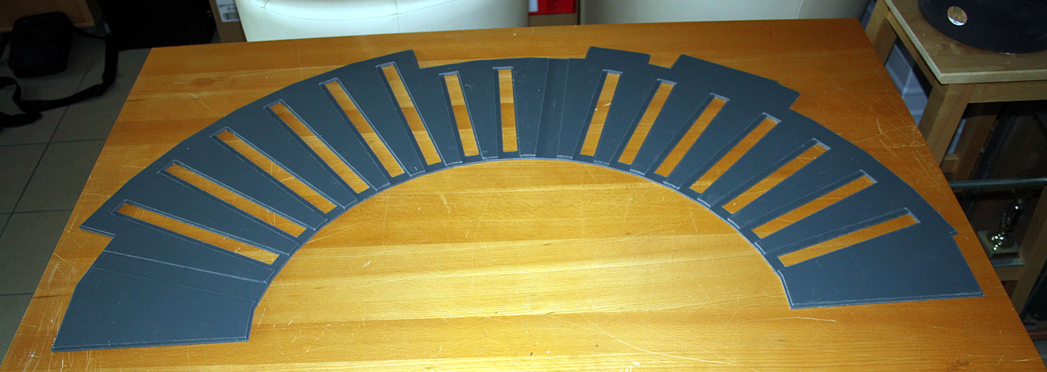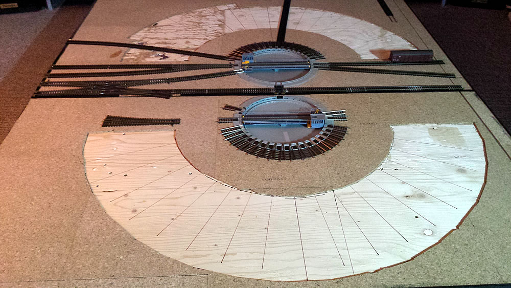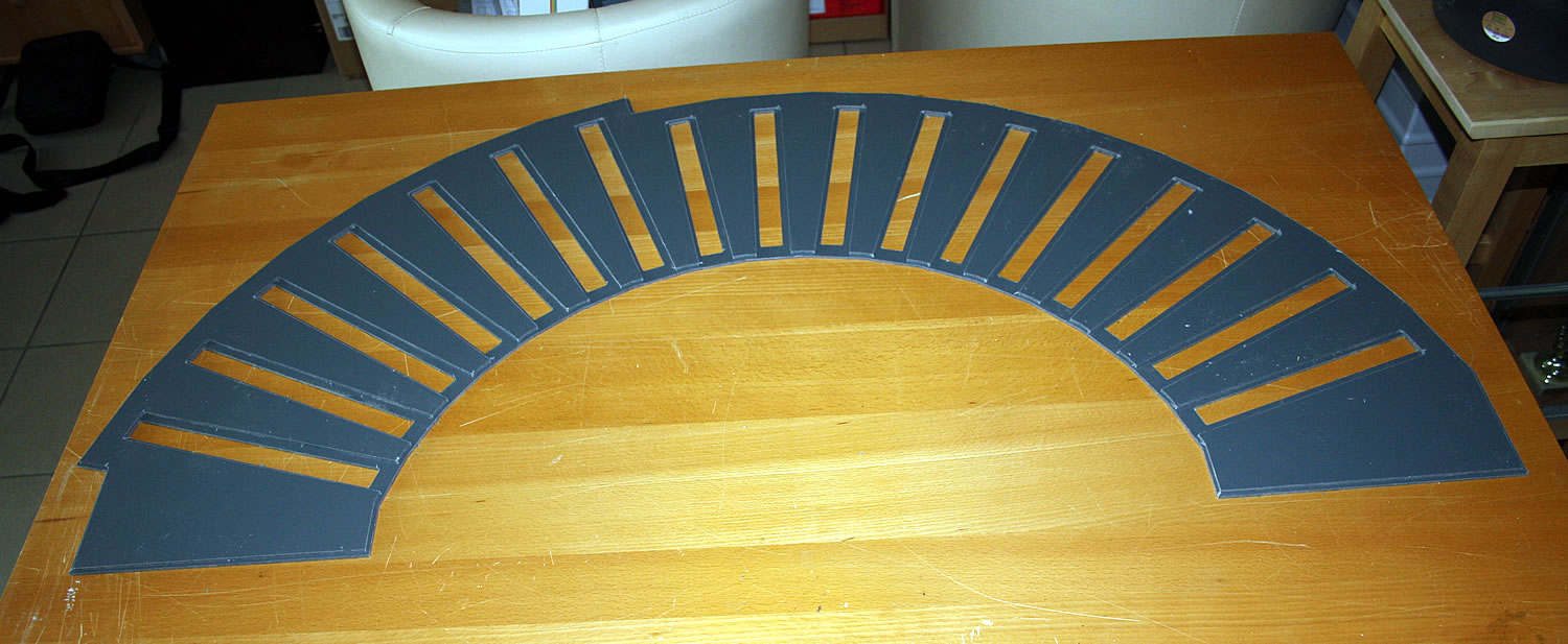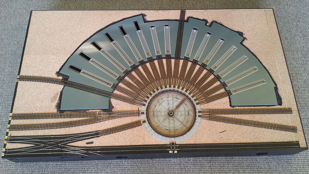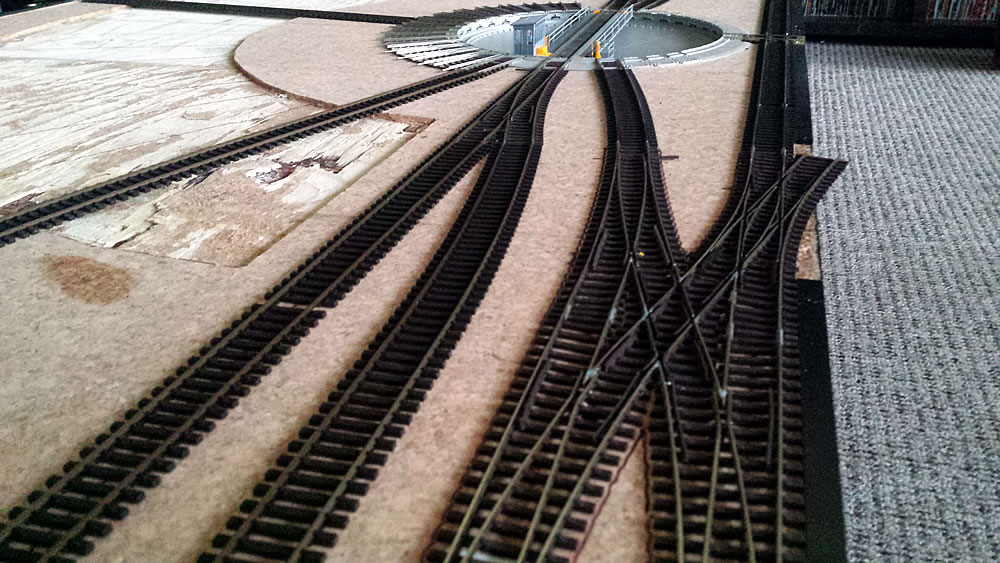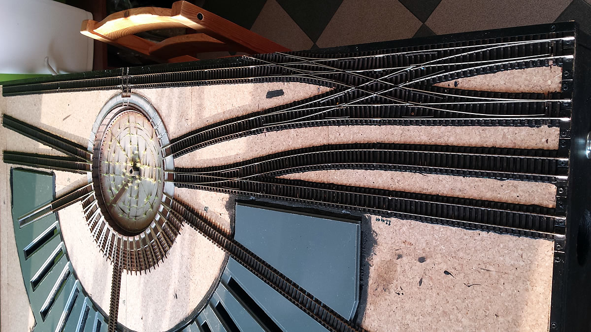 Na řadě je severní točna. Po vyjmutí mostu jsem na výjezdových kolejích odlámal výstupky zámků, výjezdy na tvrdo nalepil a ošklivé díry přelepil tenkým páskem plastu. Celou jámu jsem natupoval štětcem Surfacerem 500 aby byl povrch hrubší. Teď vyvrtám otvory pro zastavovací kontakty pod jednotlivými výjezdy a přijde na řadu patina jámy, zeleň a usazení do podkladu. Most točny musím upravit celkem dost. Točna Roco má jen jedny schudky dolů do jámy a vršky mají dvoje a navíc musím boudu přehodit na druhou stranu mostu...