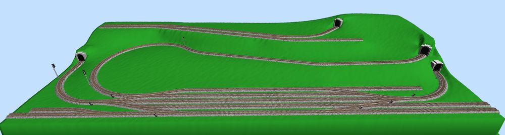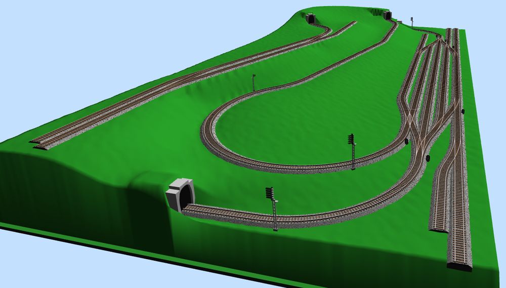 Ten horní tunel bude trochu jinak, ale ve SCARMu mi to nejde úplně přesně nakreslit. Bude o dost kratší, nejdřív zářez, pak tunel, z tunelu ven na malý most přes potok a potom do horní stanice.