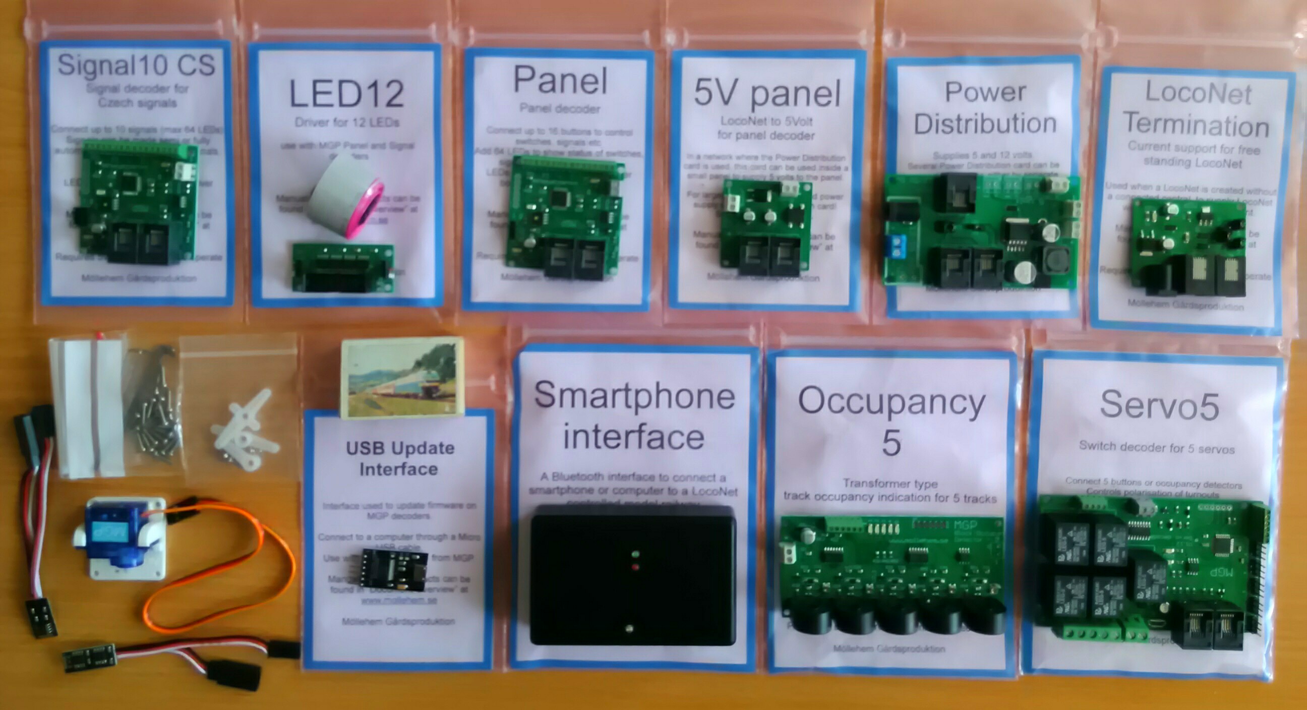 Před pár dny dorazila první část potřebných dekodérů, ovladačů, driverů, serv a všech těch věcí, kterým se dá vyhnout, pokud si zvolíte analogové ovládání. Já se ale rozhodl pro plnou digitalizaci kolejiště a ze všech možností si vybral švédskou MGP. Jestli to byla dobrá volba, to teprve zjistím, zatím ležím na gauči a čtu návody. :shock: