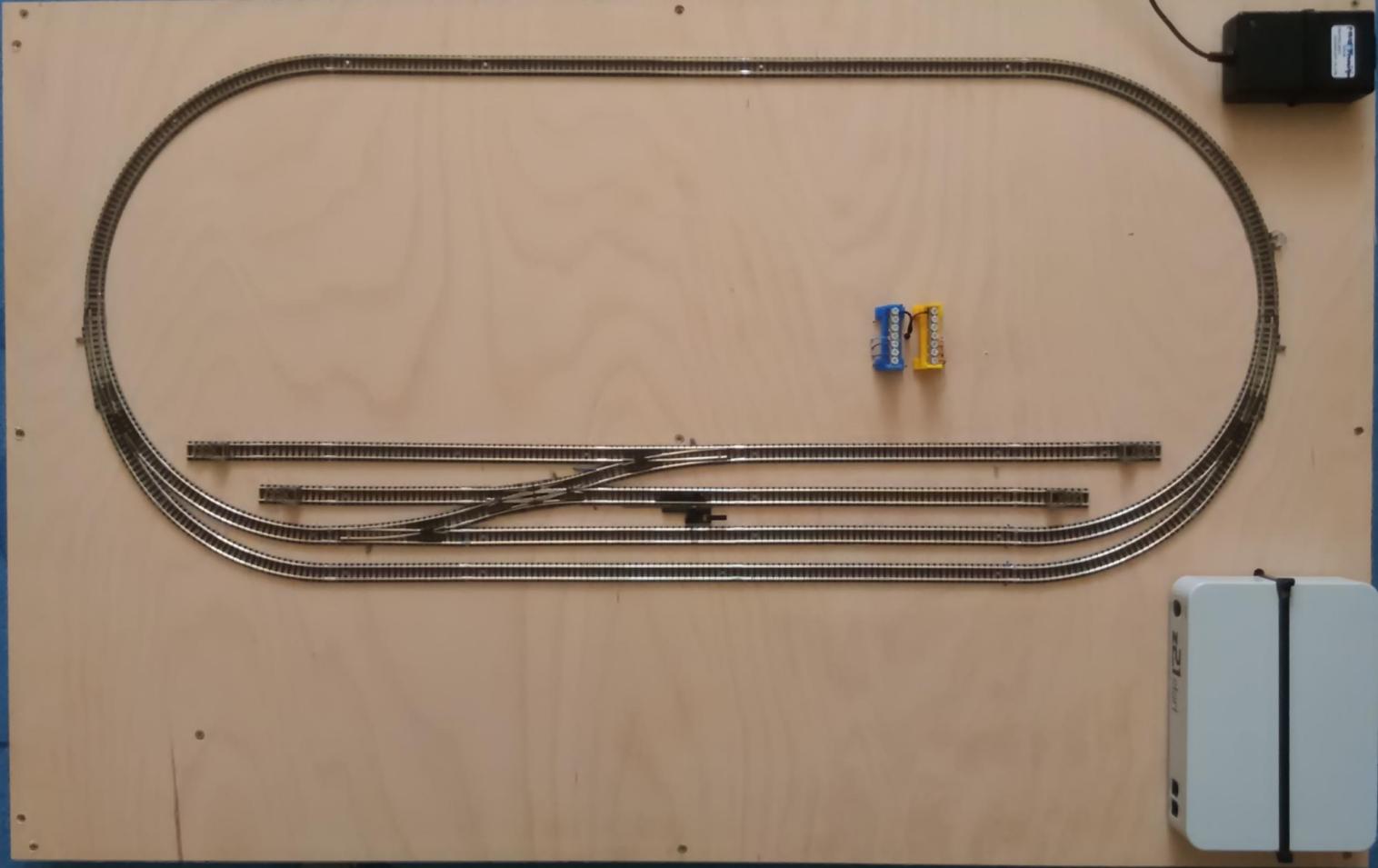 Řekl jsem si, že bude lepší MGP nejdřív otestovat, jak se zde hezky říká, "na prkýnku". Jenže přehazovat jednu výhybku sem a tam, jak jsem viděl na YouTube, mne moc neláká, tak jsem to prkýnko pojal víc velkoryse a složil na překližce 110x70 jednoduchý ovál a na něm budu zkoušet jestli MGP zvládne vše. co po něm budu chtít. A ano, fakt jsem to tam přitloukl hřebíkama :-) V této chvíli mám zapojenu jen krabici z21 start, takže vlaky už jezdí. Chvíli jsem řešil, zda dát jednotlivé MGP moduly dolu pod desku, nebo nahoru. Nakonec je budu dávat nahoru, abych na ně pořádně viděl, jestli dělají co mají. Ta černá krabička vpravo nahoře je starý zdroj od notebooku, který to celé bude krmit eletřinou.