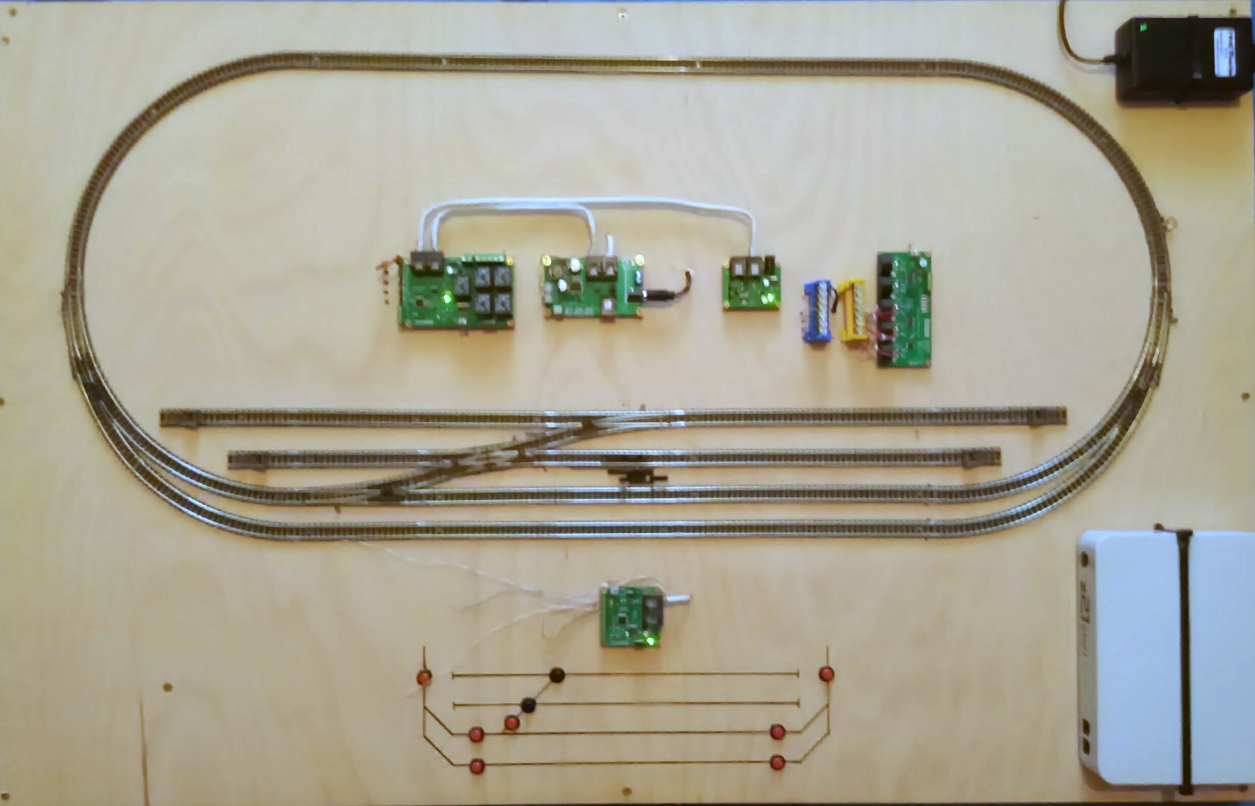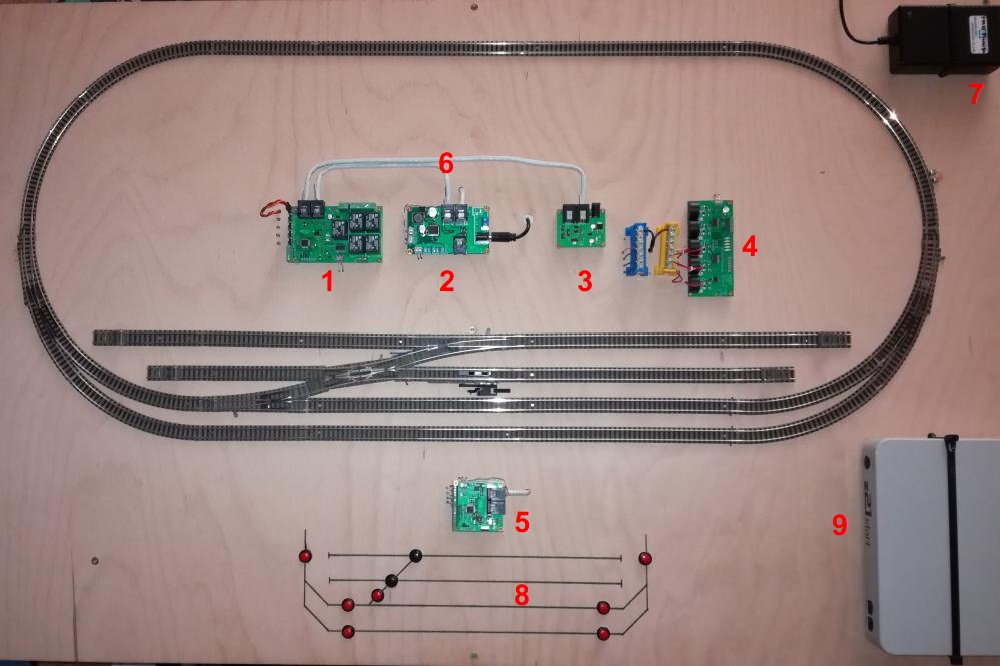 5) Panelový dekodér. K němu lze připojit až 16 tlačítek pro ovládání všeho. Tenhle modul je opravdový majstrštyk. Pro každý ze 16 vstupů lze naprogramovat co znamená, jestli je spínán tlačítkem či vypínačem a co má udělat. Jedná se o spoustu možností. Já ho v této sestavě používám pro volbu jízdních cest a přestavování výhybek. Do každého dekodéru je možno naprogramovat 12 jízdních cest ovládaných až 24 tlačítky (pokud tedy tlačítku dáte samostatnou adresu - může totiž být klidně připojeno i k jinému dekodéru). Pak je ovládání možné zapojit jako skutečnou reléovku - klasické počáteční a koncové tlačítko. Z pohledu na kolejové schéma asi je asi patrné, jak to myslím - jsou to ta červená tlačítka. Pak tam mám ještě ta dvě černá, která budou zapojena pro přestavení výhybky do opačné polohy, než ve které je teď. Samozřejmě lze výhybku ovládat i dvěma tlačítky (klasicky přímý / vedlejší směr) nebo standardním páčkovým přepínačem. K dekodéru lze připojit i LED diody u kterých se nastaví kdy, jak a jak moc (odpadá tedy používání rezistorů) mají svítit. Smysl jejich použití asi tuší každý.