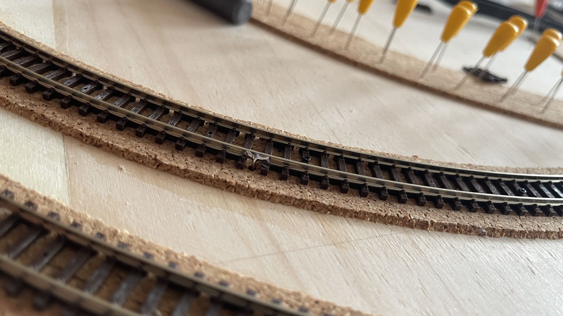 Tak jsem to chtěl původně, ale s flexikolejí mi to přišlo jako podstatně obtížnější než takto z boku. Sice by to asi vypadalo líp, ale takhle z boku to taky trochu zakreje štěrk a to pájené místo kdyžtak trochu přetře rzí.