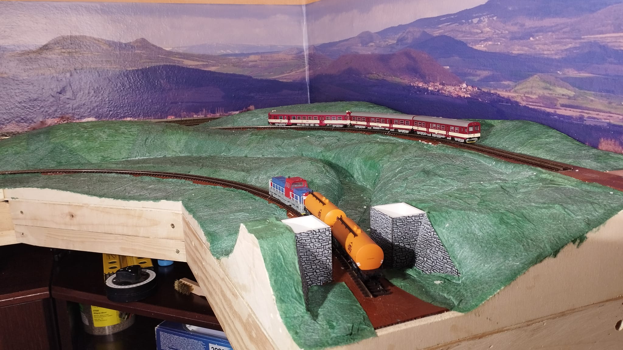 No ještě, že jsem dbal na rady zkušenějších a pro zprovoznění Rocrailu, DR5000 a DR4088 jsem vyrobil testovací segment. Za velké pomoci přítele na telefonu už to všechno funguje, ale řezání kolejí pro oddělené úseky a letování drátků bylo požehnaně.