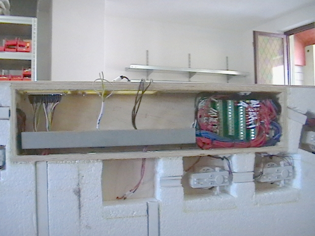 Všechny vodiče z kolejiště jsou stažené do pětice řadových svorkovnic. První tři jsou vyvedeny jednotlivě do canonu/ů, a to tak, že je zespoda na každý pól svorkovnice připájen vodič, který vede do canonu. Zbylé dvě svorkovnice jsou zespoda natvrdo propojeny. Jedna sbírá jeden trvale pospojovaný pól jedné kolejnice, druhý sbírá všechny trvale napájené úseky druhé kolejnice. Tzn širou trať a části zhlaví. Izolované úseky a přepínání výhybek je zapojeno do prvních třech řad svorkovnic. Byla to celkem dost práce. Každý vodič zapojený do svorkovnice má popisovací návlečku, na které je napsáno odkud vede a na který pól které svorkovnice je připojen. Tím je zaručena snadná dohledatelnost každého spojení. Svazky vedoucí do canonu jsou zase popsány, aby bylo jasné, na který pin canonu je připojen konkrétní pól svorkovnice.