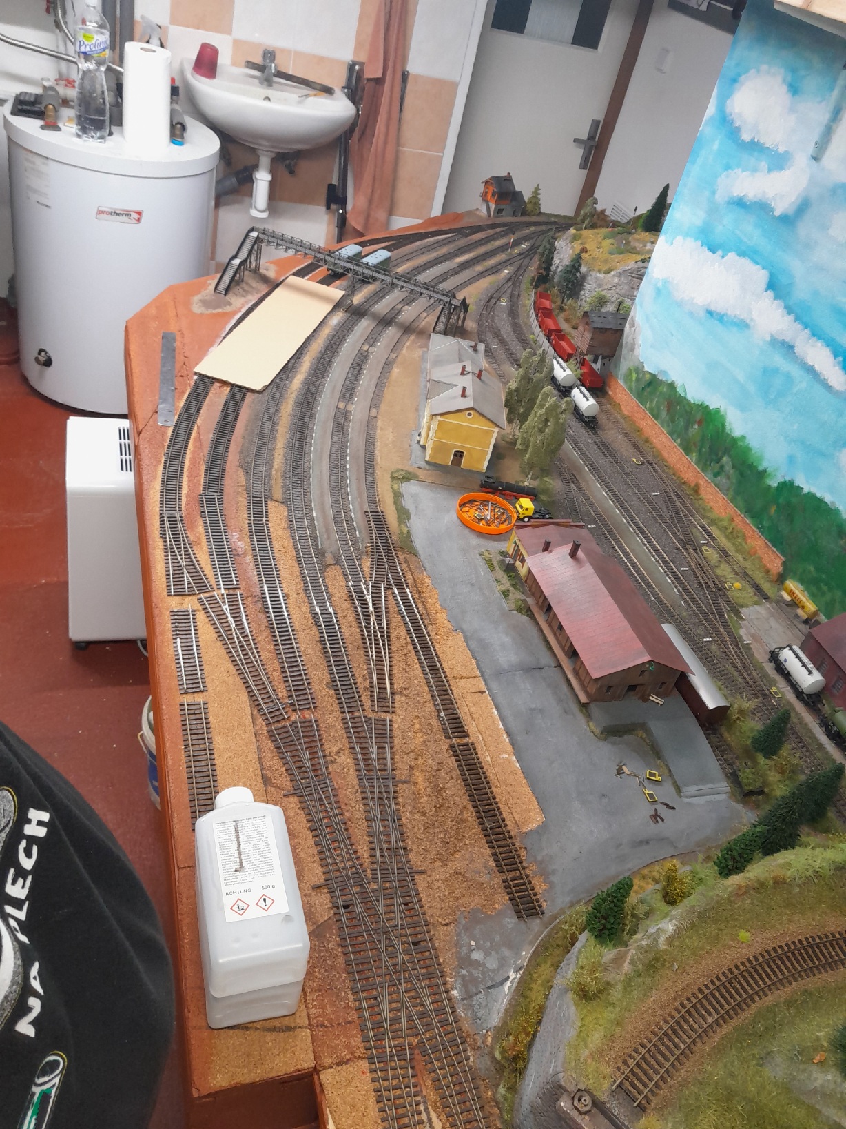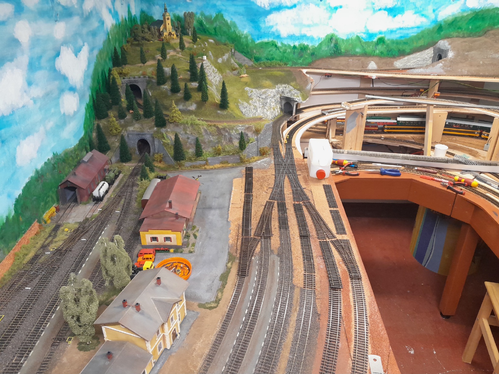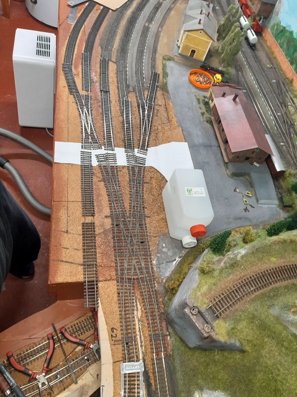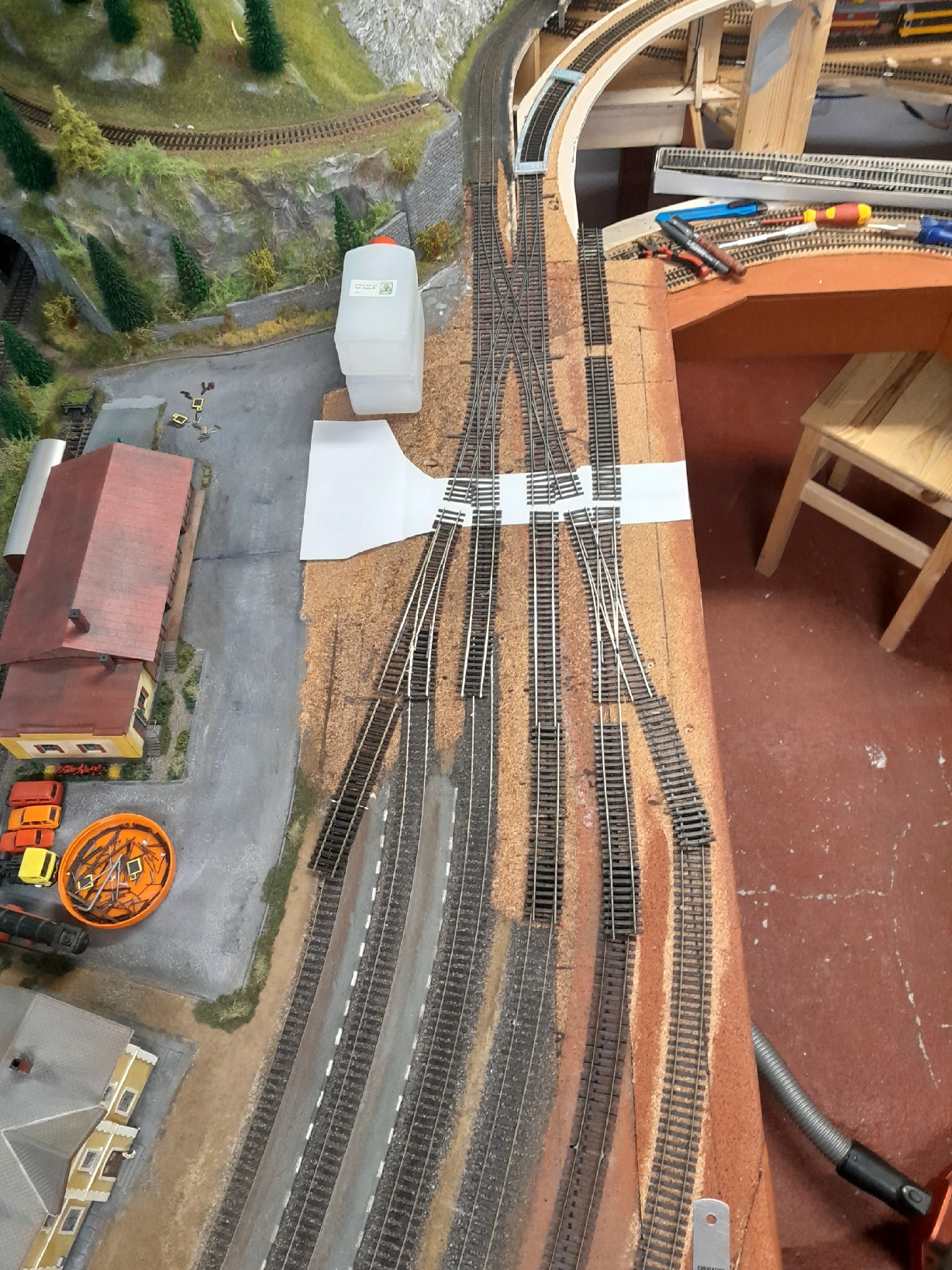 Musíš tam mít ty kusé koleje? Kdybys zrušil tu u kraje a tu druhou zkrátil, vlastně by byla jen jako odvrat, můžeš mít přejezd mezi angličany a stanicí. Na uvolněné místo můžeš osadit stavědlo, nebo tam udělat ten svah, jak jsem psal dřív.