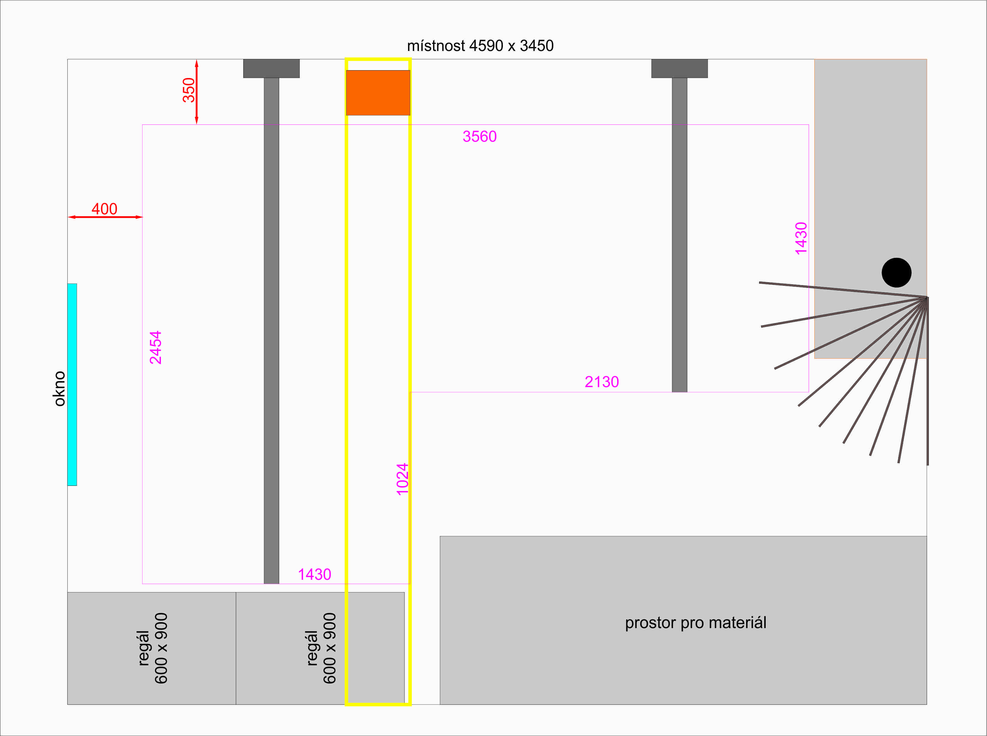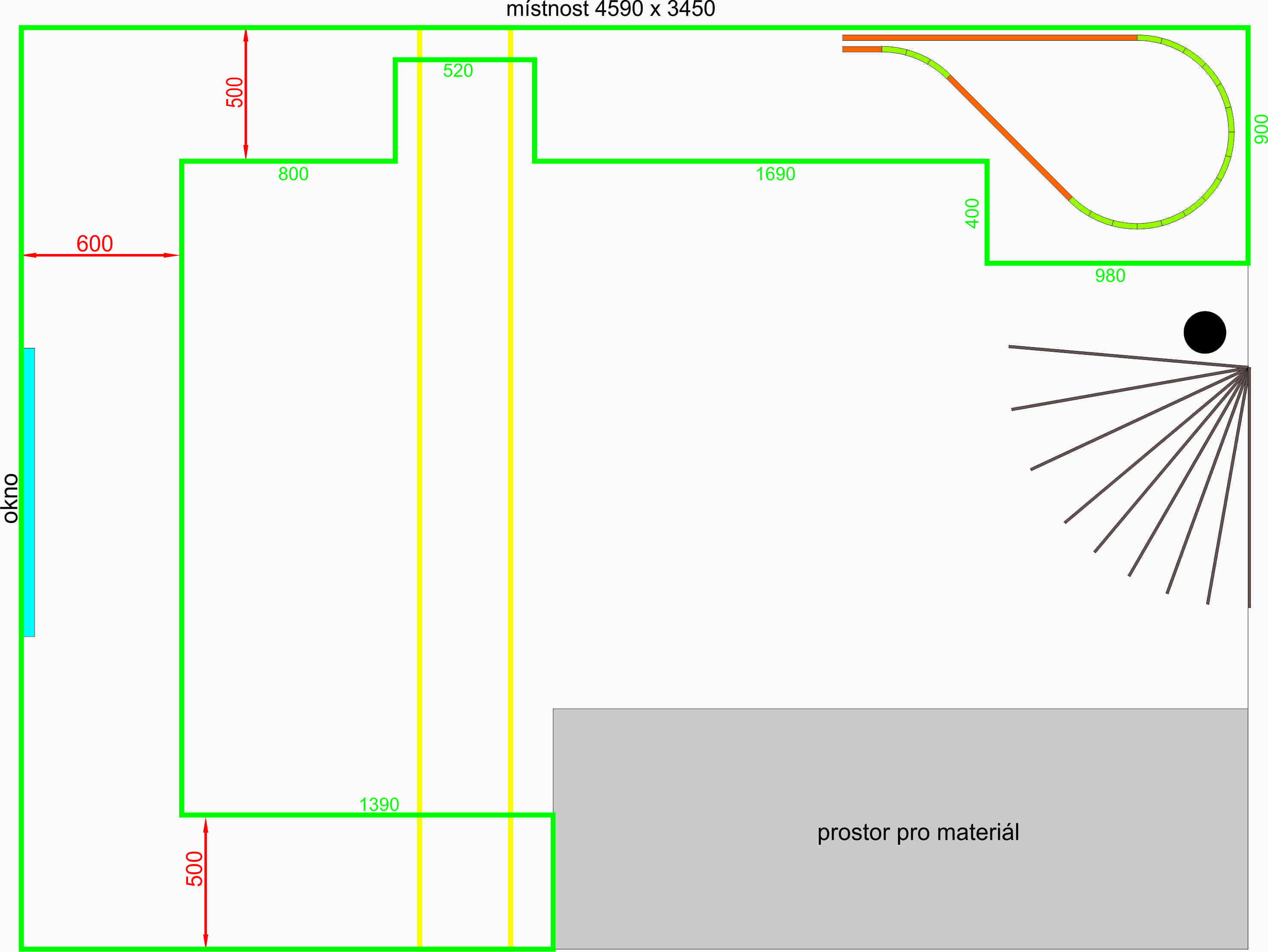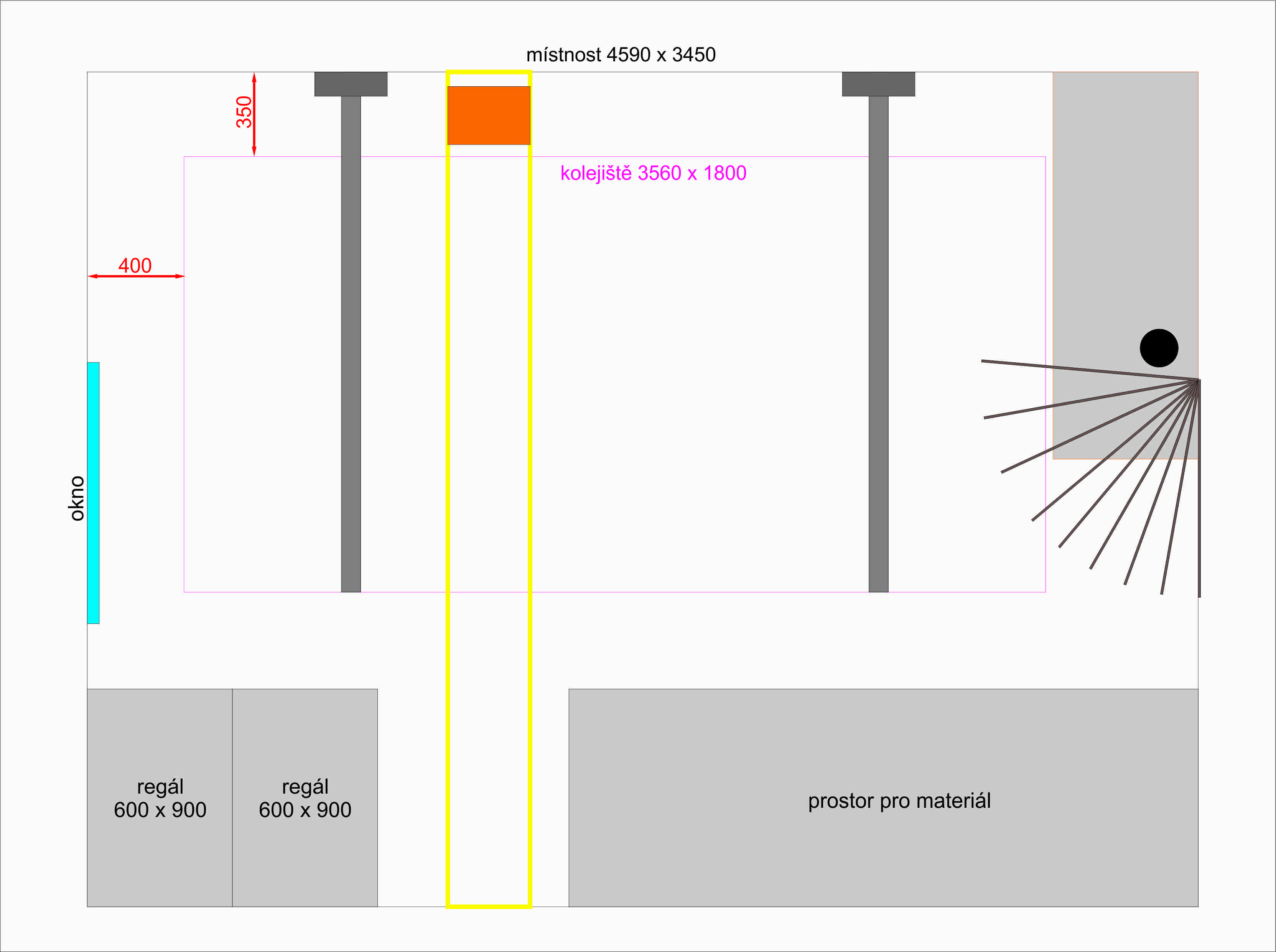Přeměřil jsem prostor a obávám se, že z něj více nedostanu. Naopak jsem musel původní délku zmenšit na 3560. Také jsem přemýšlel udělat kolejiště do L. Potrubí (žlutý obdélník) musí zůstat. Kolejiště se musí vždy zvednout nad otevřené dveře a pod potrubí. Na protáhnutí člověka pootevřené dveře stačí, ale na vyndání materiálu to nestačí. Jak jsem již zmínil, tak místnost musí sloužit nadále jako provozní skládek. Uložený materiál a regály s provozními věcmi.
