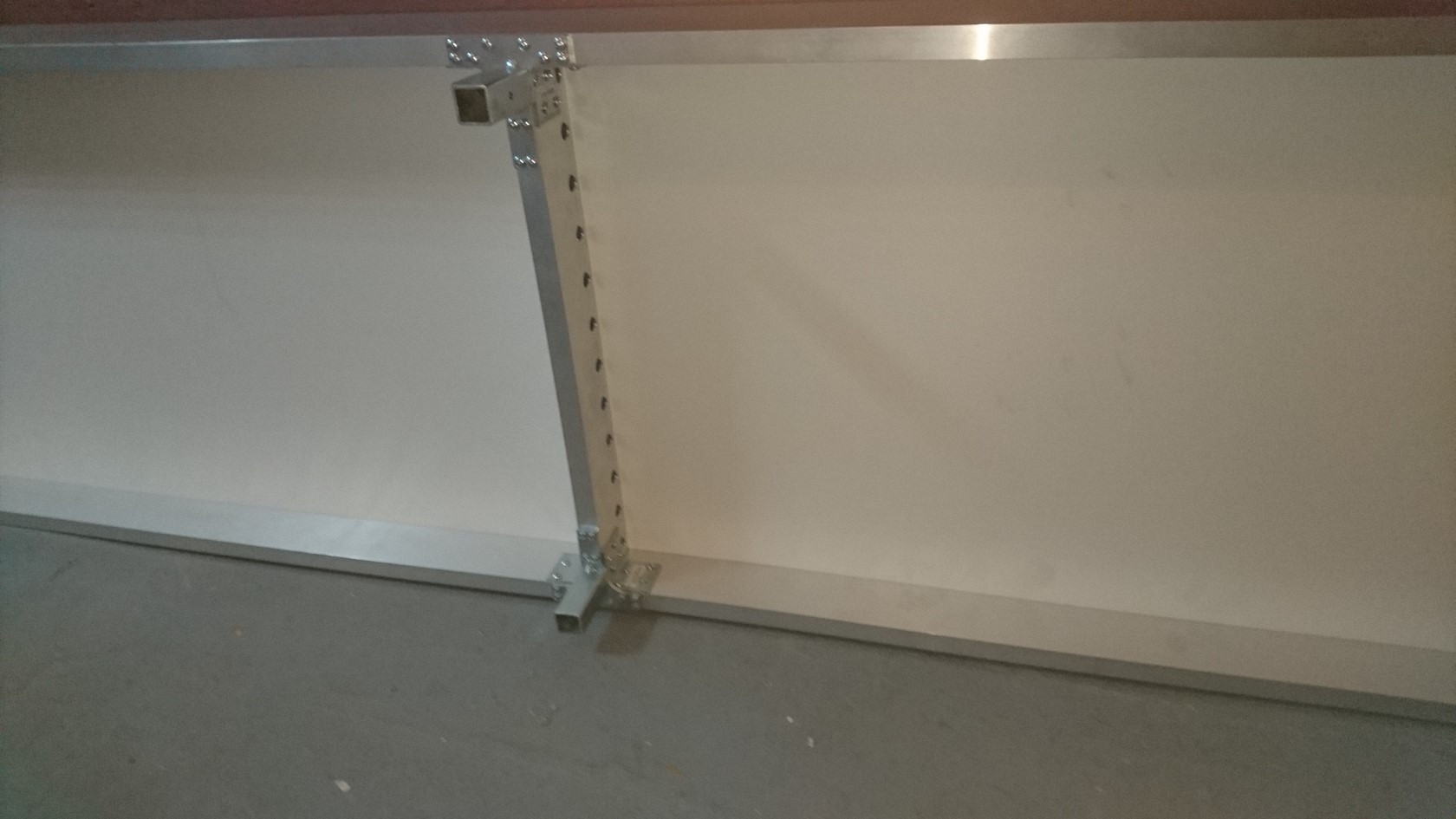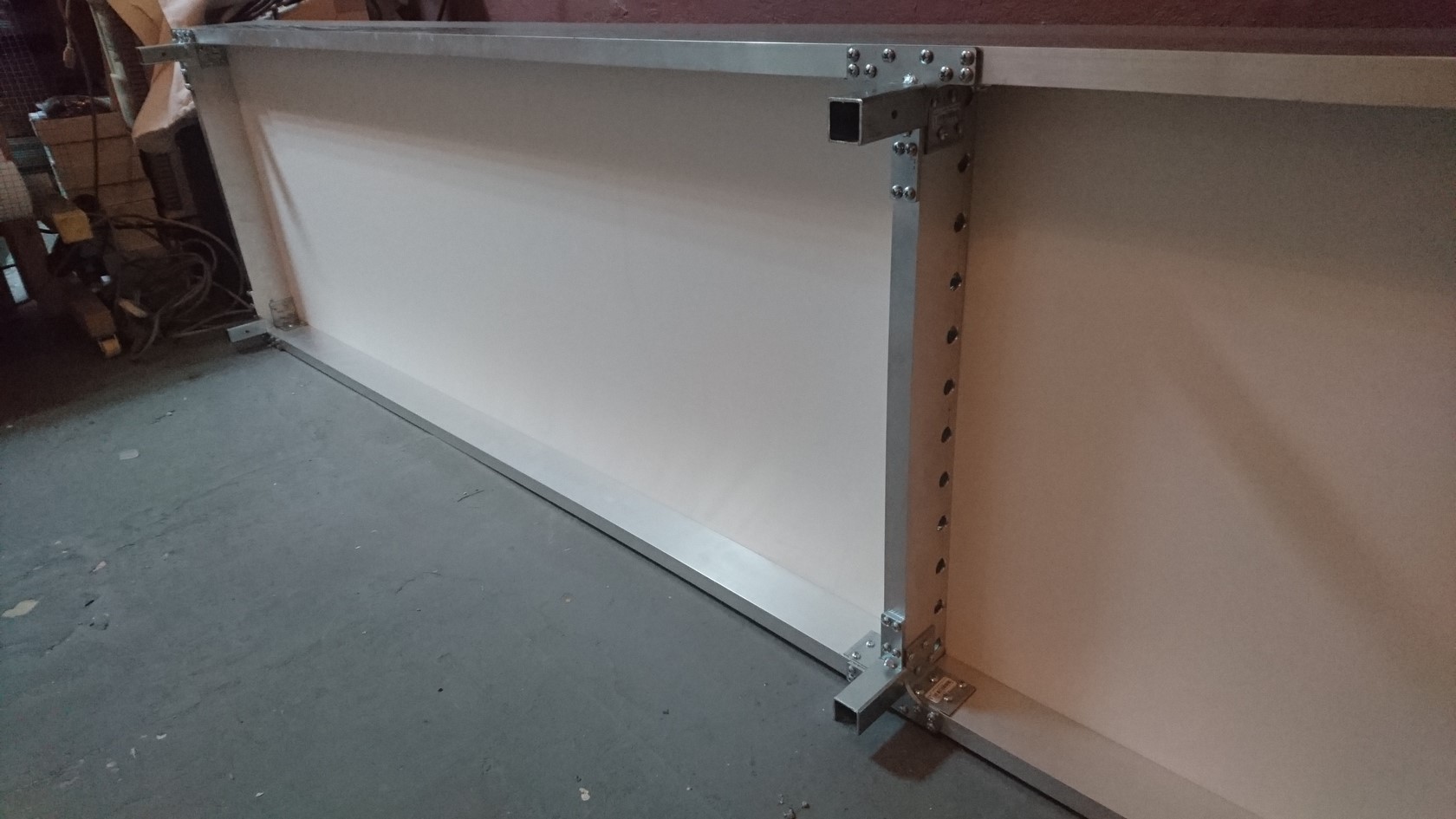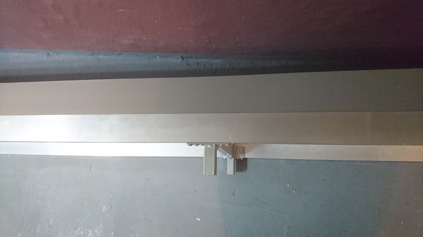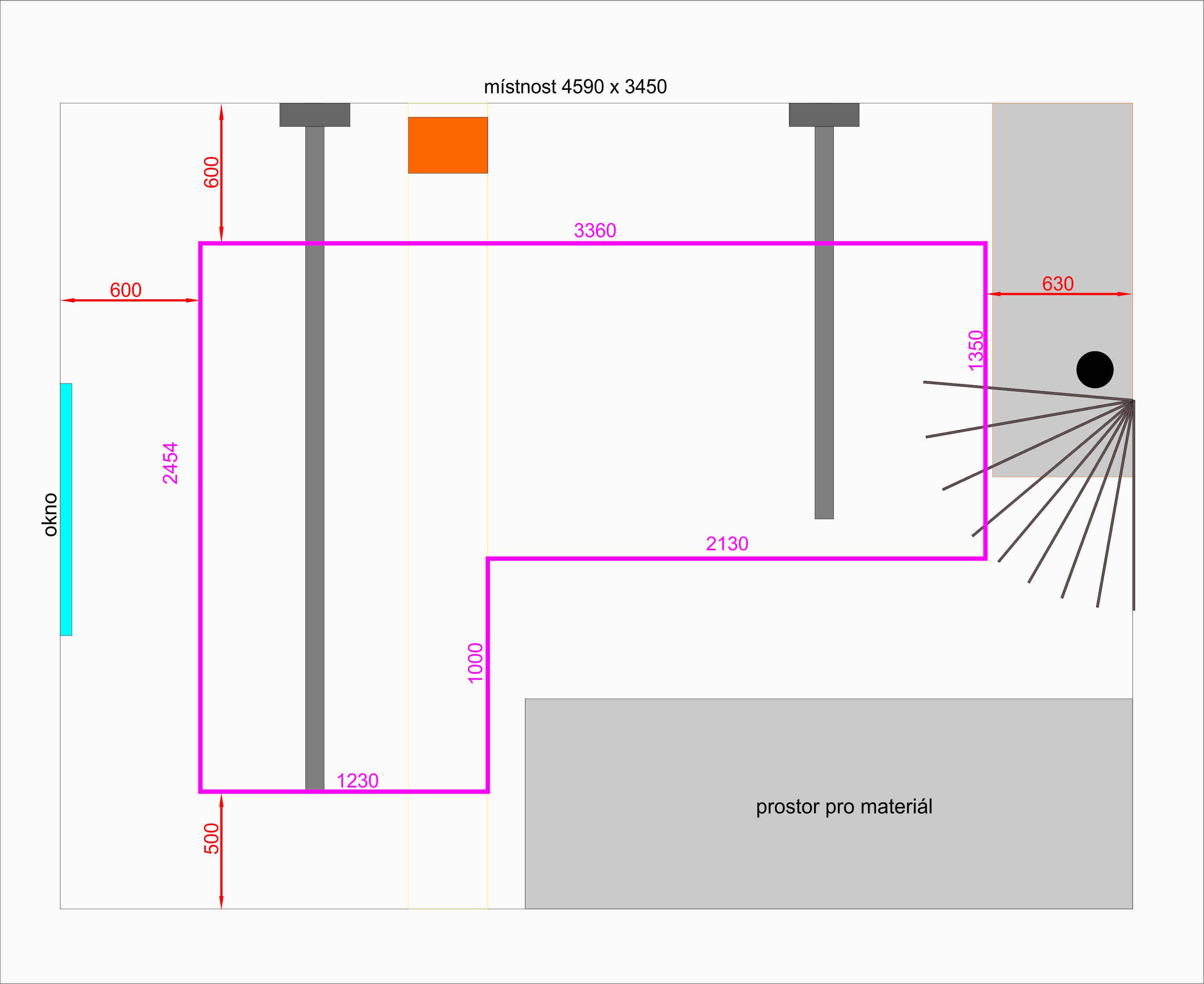 Přeměřil jsem prostor a obávám se, že z něj více nedostanu. Naopak jsem musel původní délku zmenšit na 3560. Také jsem přemýšlel udělat kolejiště do L. Potrubí (žlutý obdélník) musí zůstat. Kolejiště se musí vždy zvednout nad otevřené dveře a pod potrubí. Na protáhnutí člověka pootevřené dveře stačí, ale na vyndání materiálu to nestačí. Jak jsem již zmínil, tak místnost musí sloužit nadále jako provozní skládek. Uložený materiál a regály s provozními věcmi.