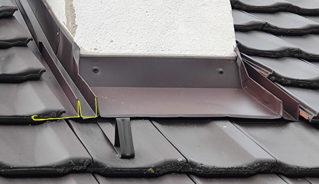 Právě že ne, takto to je dobře. Pokud by si použil na střechu třeba ohýbané pásy z plechu s profilem třeba vlnek, pak by ten plech mohl být pod tou krytinou, ovšem jeho bok by musel být zvednut nahoru v místě té vlnky. Tady je ta krytina rovná, ten svislý kraj tam tudíž neuděláš a voda ti tam bude zatýkat. Takhle mi vyču..l střechu jeden mam..s, co ten kraj sice zvednul, ale zapomněl, že místem mezi komínem a střešním oknem při pořádném slejváku poteče mnohem víc vody, než co se vejde do 11 cm šířky a 1 cm na výšku, i když to je na sklonu 35°.