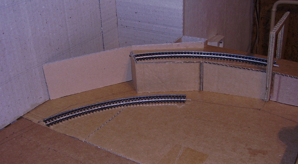 Skryté nádraží jsem měl původně v úmyslu stavět jako průjezdné se stoupajícími spirálami spojenými navzájem angličanem (viewtopic.php?f=1&t=6814#p109940), pod ním mělo být ještě jedno rozšiřující koncové SN (viewtopic.php?f=1&t=6814&start=75#p130408). Variantu spirál jsem pro toto kolejiště ale definitivně opustil a vrátil se k vratným smyčkám, kde stoupání vycházelo o několik promile menší.