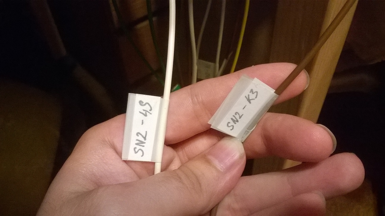 Kromě barevného rozlišení vodičů zmíněného výše, používám barevné štítky na koncích s popisem úseku, nebo výhybky, ke které patří. Barvy štítků částečně vychází z NEM 605.
