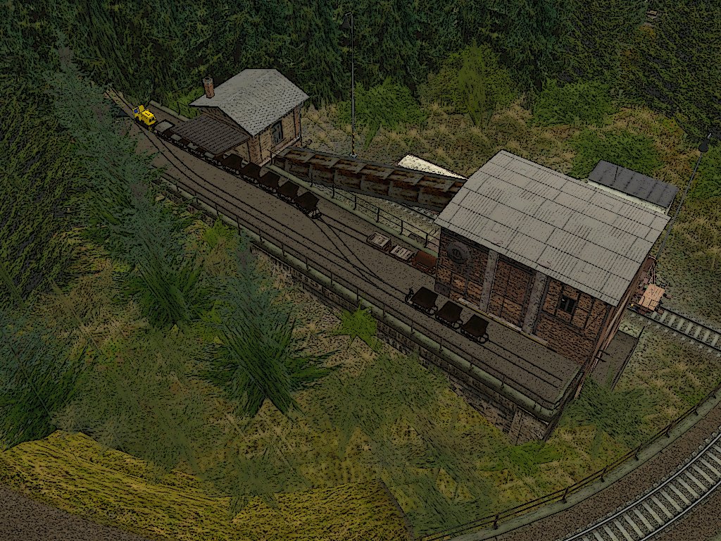 Opticky jsem nebyl s výslednou podobou areálu drtiče kamene spokojen, proto jsem "stanici" průmyslové drážky přizvedl.