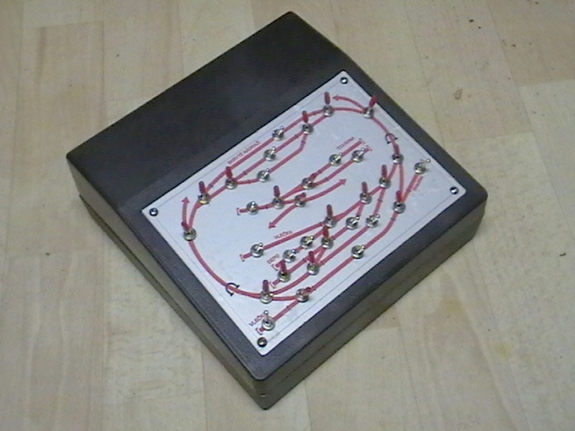 Ovládací pultík je fyzicky hotov, ale zatím nezapojen. Přepínače s červenou čepičkou ovládají výhybky, stříbrné bez čepičky spínají úseky. Anebo si to Lukáš udělá naopak. Každopádně i takto stísněný plácek pojmul 32 páčkových přepínačů (z toho 18 na výhybky) dostatečně dobře na to, aby se mezi sebou páčky nemlátily a byl k nim dobrý přístup.