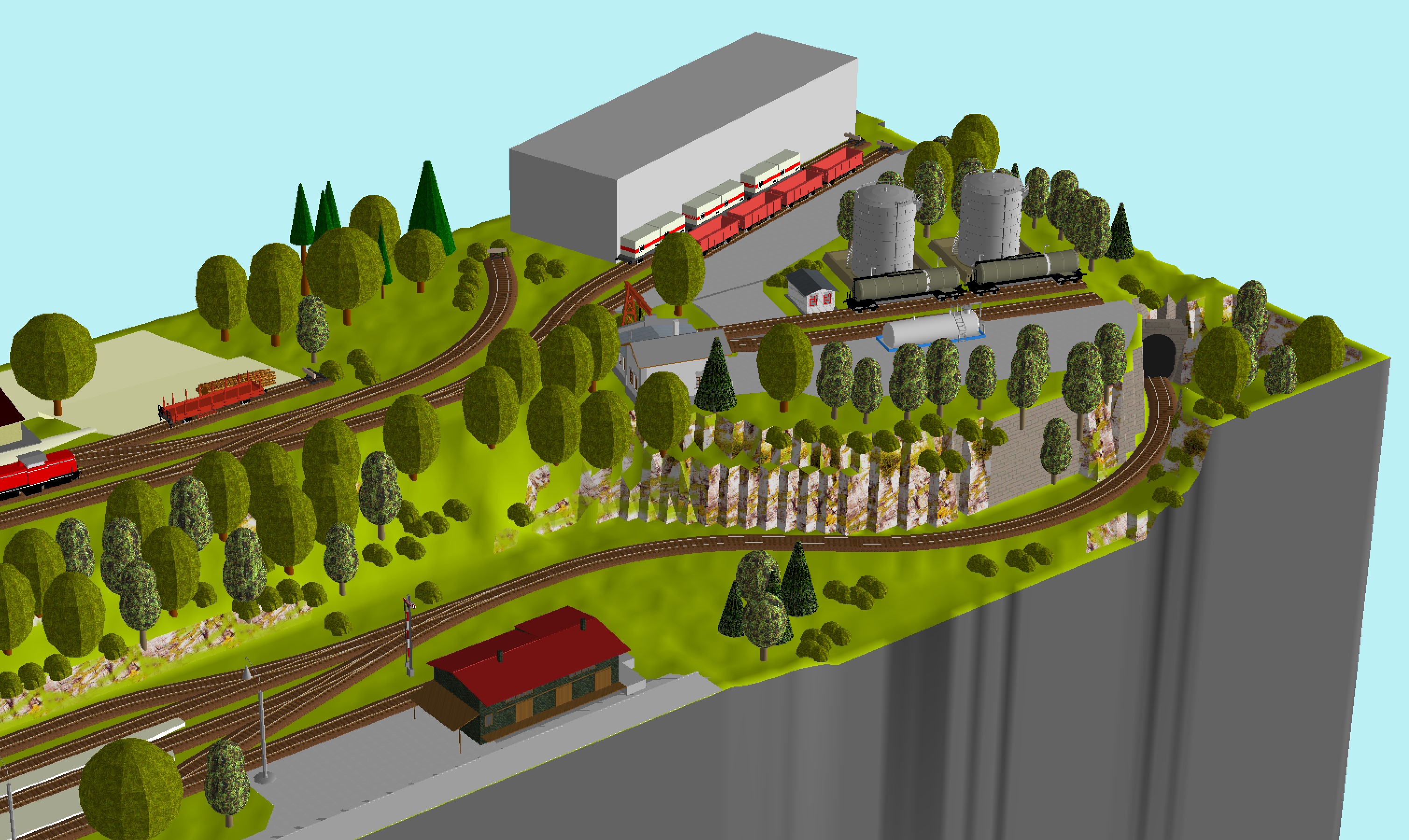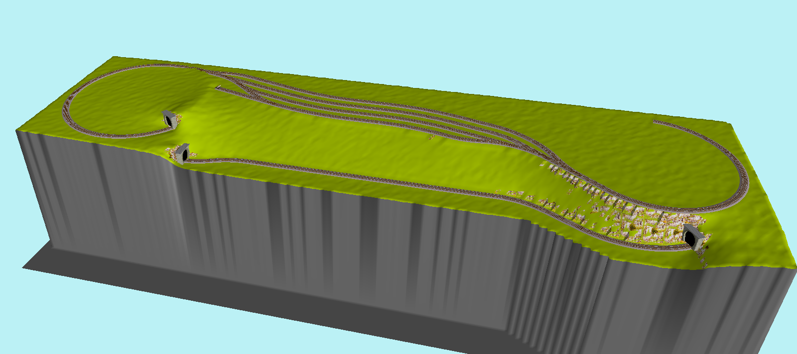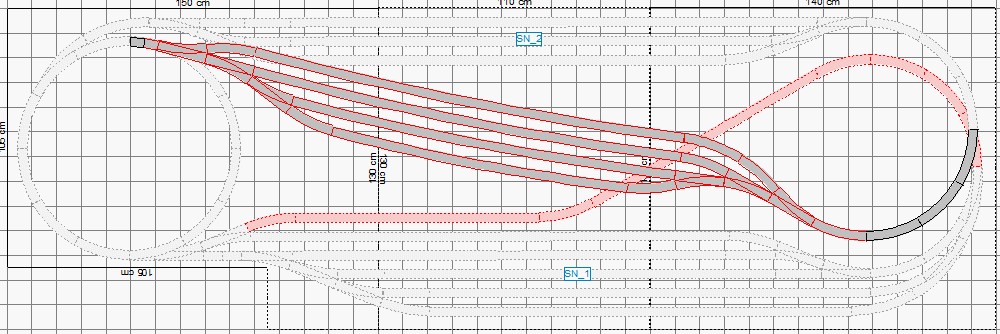 Tak zatím jsem zkusil spodní patro a patro s hlavní stanicí. Není to nic extra a stanice je taková pokroucená (rMin mimo zhlaví z kusovek je 1600mm), spíš bych ji pak narovnal, případně zahnul jenom do jedné strany v mnohem větším radiusu