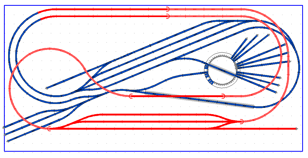 - z mého pohledu trochu lepší verze by bylo třetí kolej odspodu připojit k vrchní části nádraží, pozměnit levé zhlaví na obloukové vyhybky a pak upravit podle předchozího bodu