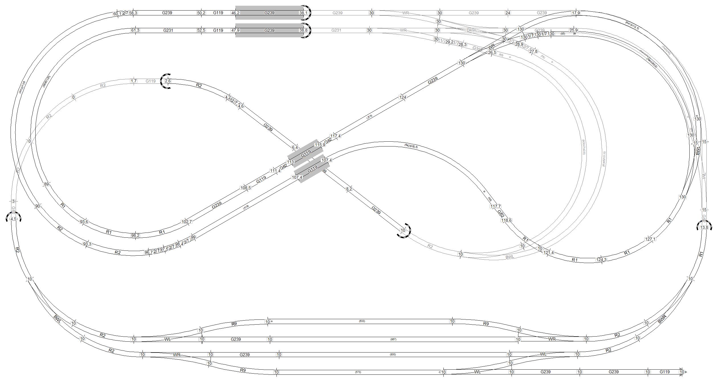 Přikládám plánky z programu Scarm. Plán byl modelován z konkrétních kolejí firmy Piko, ale jelikož jsem se nevlezl počtem kolejí do free verze programu, musel jsem nahradit flexikolejemi. Použití flexi je tedy čistě z kapacitnách důvodů free verze programu. Sklony nejsou modelové, ale dané soupravy je zvládnou. Máme vyzkoušeno na testovacím kolejišti včetně podjezdu, výšky tunelu.