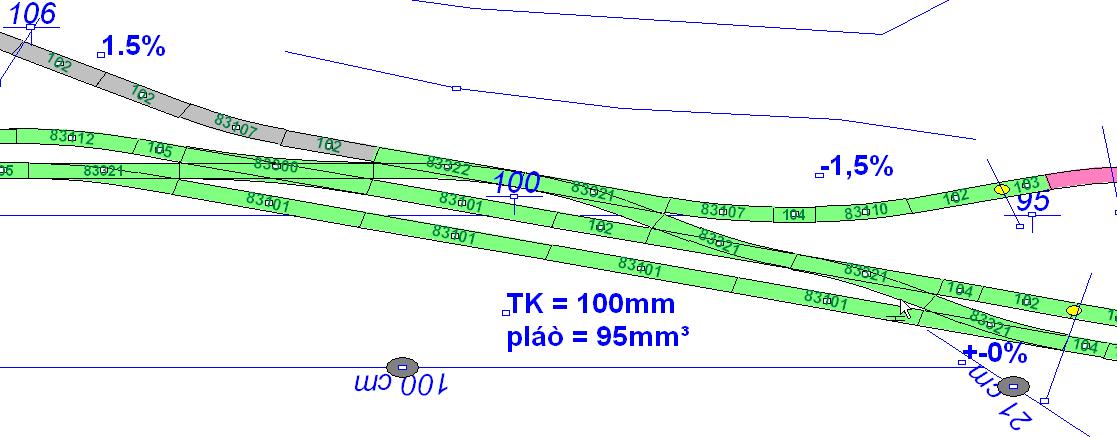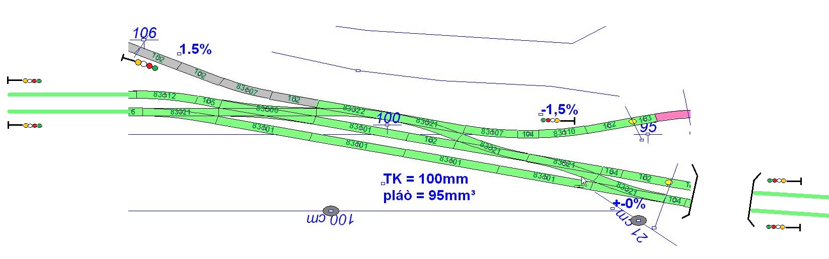 muzete mi, prosim, rozmistit navestidla do vyhybny viz obr. tak aby to davalo aspon trochu smysl ? Zelena trat je "jakoby" hlavni - dvojkolejka (falesna), za vyhybnou vpravo leze do tunelu, vlevo vede cca 3m viditelne. Tunel 2kolejky (vpravo) bude po cca 50-80cm otevreny pohledu zboku, pravdepodobne tam bude nejaka jednoducha krajinka (2kolejka obkruzuje celo kolejiste viditelne pri vstupu do klubovny). Ruzova trat leze cca 20cm za vyhybnou vpravo do tunelu, ma to byt vedlejsi / regionalni trat - pravdepodobne pokracujici do sedive trate (ta stoupa, casem (~2m) nadjede dvojkolejku a stoupa k nadrazi (nejvesi viditelne v modelu). Provoz na 2kolejce je navrzeny primarne levostranny (tzn. po dolni / vnejsi koleji se jezdi smerem vlevo).