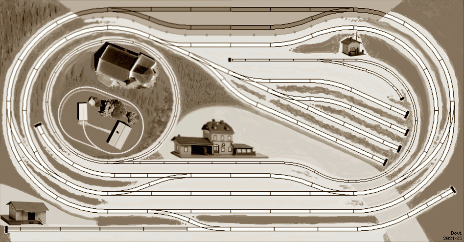 Proto bych to raději asi nekomplikoval a nechal toto jednoduché kolejiště dle původního záměru sice víceméně vodorovně, ale pár "přirozených" menších nerovností tam samozřejmě bude - mj. např. ten náznak skalního ostrohu s kostelíkem, dále povlovný svah v SZ rohu apod. A možná se trošku zvedne (až pak dál v hloubce kolejiště) i ten vnější okruh hlavní širé trati včetně SN - uvidíme.