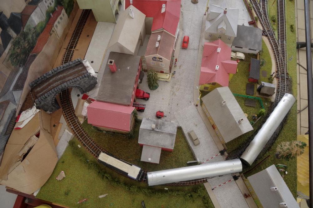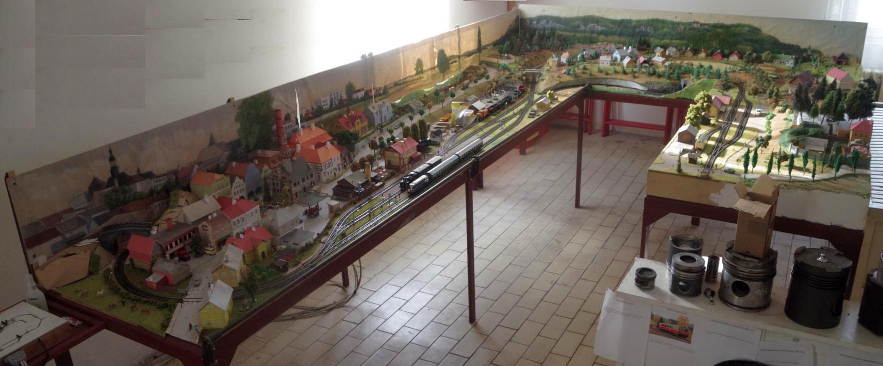 Zvednutí s ohledem na současnou konstrukci kolejiště je nereálné a navíc by tam děti neviděli a mohli by se uřezávat nohy. Zvednout současnou desku výš by byl dost velkýí problém, muselo by se toho bourat o hodně víc, takže by to bylo skoro na novostavbu... nosná podkladová OSB deska je zvrchu přišroubovaná do kovového spodku stolu, do ní jsou přišroubované slabší desky na kterých jsou položené koleje a rovný terém na většině největšího stolu (šrouby by se museli hledat pod vším co tam je, pod trávou, silnicema...) koleje jsou hřebíky přitlučené vezkrz obou desek s konce vyčnívají dole, elektrika je natahaná zespod pod OSB deskou a tahaná spodem i pod příčkama v konstrukcí stolu (takže aby se deska dala sundat musela by se přetahat elektrika)... V plánu je nechat spodní odbočné nádraží tak jak je takže by ae bourala jen trať v tunelu a koudsek viditekný před ním spolu s lokálkou... koncová lokálková stanice je vcelku na překližce, takže ta se bourat nemusí jen trať k ní, zbytek terénu je polystyren přetaženej sádrovou krustou, takže to by z mého pohledu bylo menší zlo ubourat a pak krajinu vytvořit znova. V současném stavu je stoupání na lokálce do místa kde se tratě nadjedou ani ne 1.5 metru a větší část z toho v oblouku nejmenšího poloměru, takže těch asi 36 cm..., na dva menší stoly je natahaná elektrika od koncové stanice a několika odpojitelných úseků což by nebylo tak hrozné odpojit...