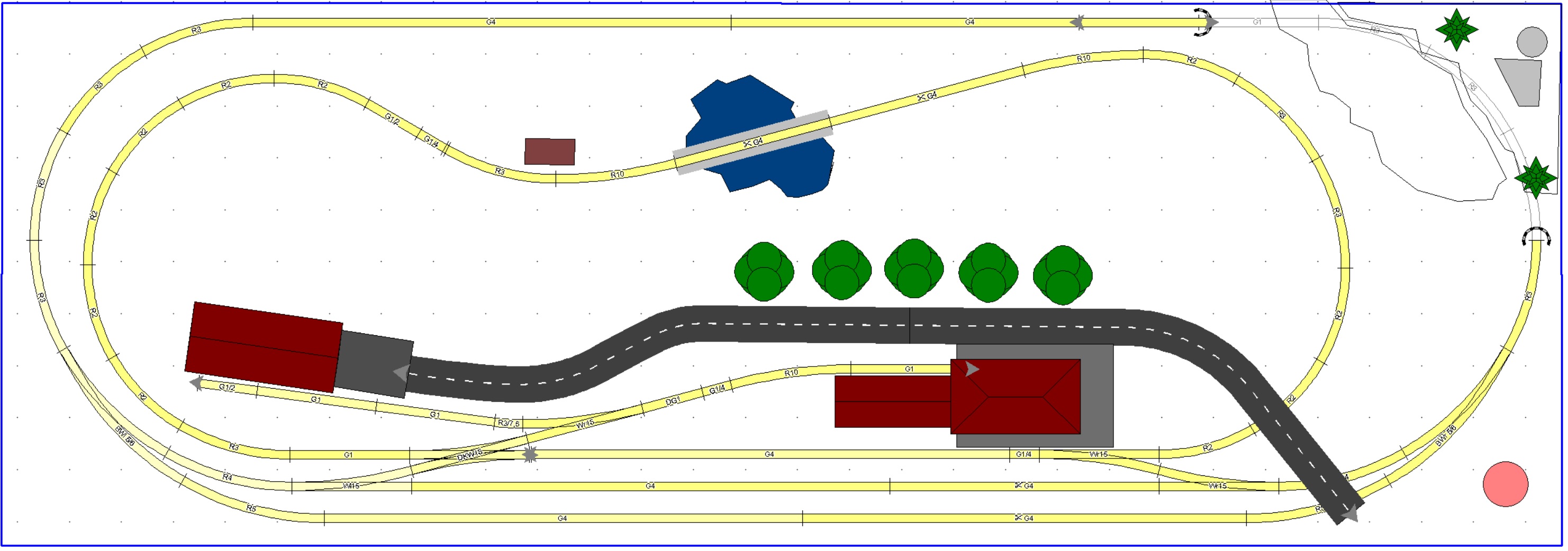 Chceš jen kroužit, nebaví tě posunovat, tak se vykašli na stanici. Vytvoř dva samostatné okruhy. Dolní okruh může být hlavní jednokolejná/dvojkolejná trať vzadu s odkrytou tříkolejnou výhybnou. Horní okruh pro lokálku s poloměry R358. Nalevo v oblouku vytvoř mini obloukovou výhybnu. Lokálka bude ve tvaru kost. V některém místě zvol něco jako přestupní terminál. Zakrytá bude část nalevo s dolním okruhem.