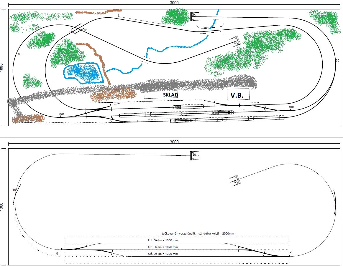 Abych jen neplkal, zkusil jsem něco nakreslit. Snažil jsem se zachovat původní myšlenku - přání Jorgese. Zachoval jsem stanici, jen jsem ji trochu učesal. Ponechaný je i kroužící okruh viditelný v celé délce. Je přidána skrytá stanice. Navržená je tříkolejná. Protože výhybky berou dost užitné délky, naznačil jsem i možné provedení v podobě "šuplíku". To jsem naznačil tečkovaně.