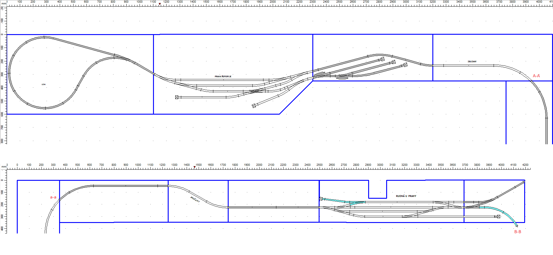 Kolejiště díky získanému prostoru mohu vést po obvodu místnosti, čímž by měla být zachována prostorová nenáročnost. Zároveň jsem zachoval jeho možnost rozebrání a uskladnění do nějaké skříně, jelikož jej mám rozložený do několika segmentů, takže podle chuti mohu též pracovat jen na vybraném kousku. Trať v podstatě na obou koncích tvoří nádraží, takže obsluha dvou lidí, kteří si mohou posílat vlaky je zajištěna. V případě "kochacího" módu, budou obě strany osazeny vratnými smyčkami. Nádraží v podstatě vycházejí ze současné podoby, jen u Řeporyj jsem se rozhodl částečně zachovat již zrušenou vlečku, která mi tak umožní odstavovat vagóny a zároveň si zde hrát s posunem a stavbou souprav. Model bych rád zasadil do současného období.