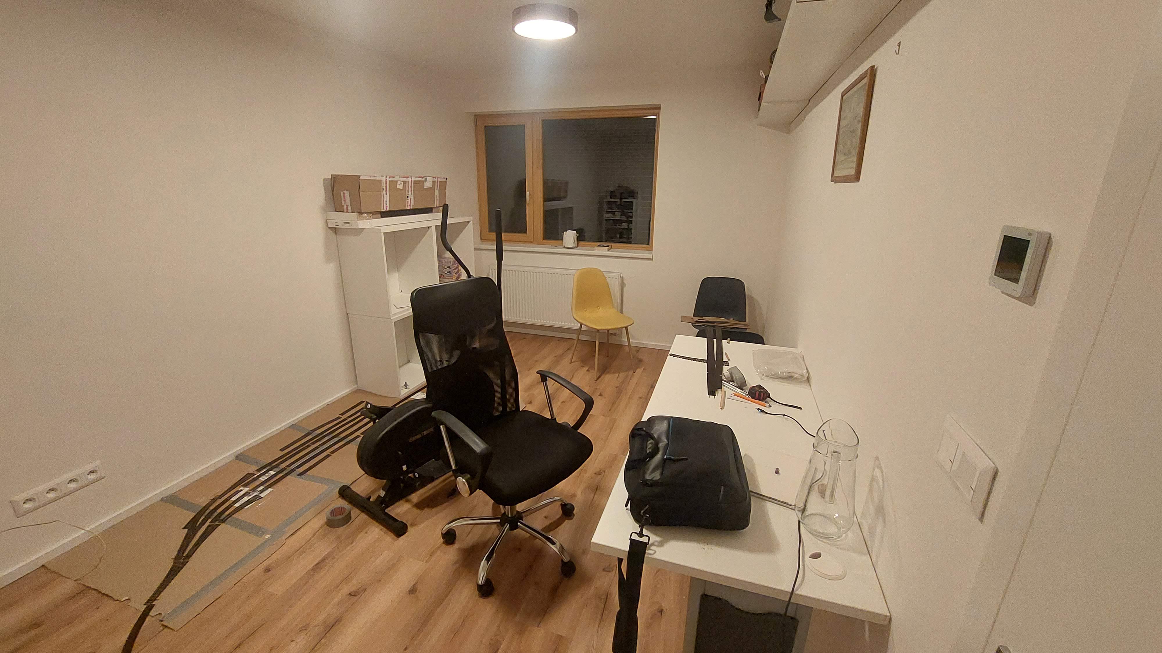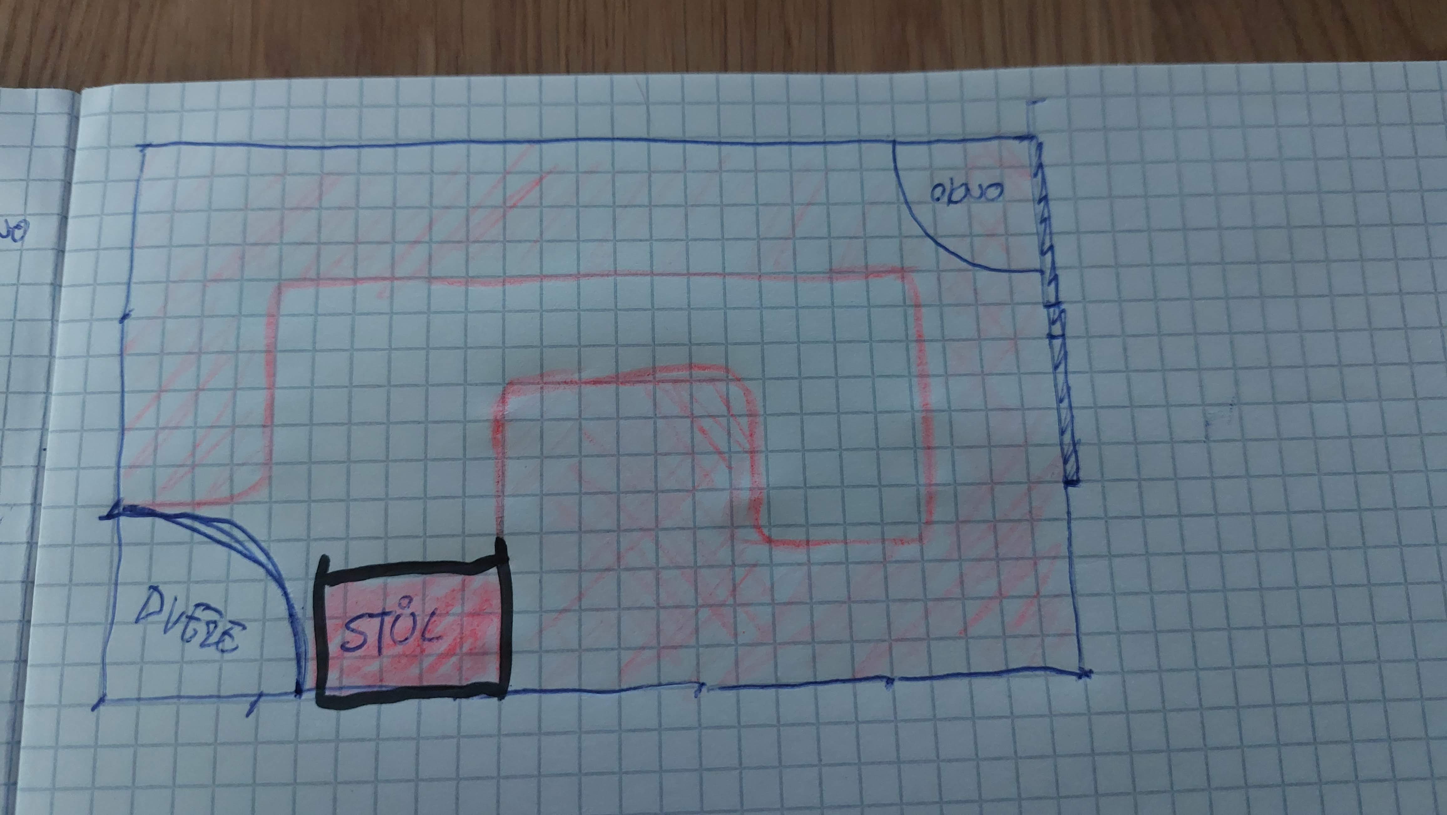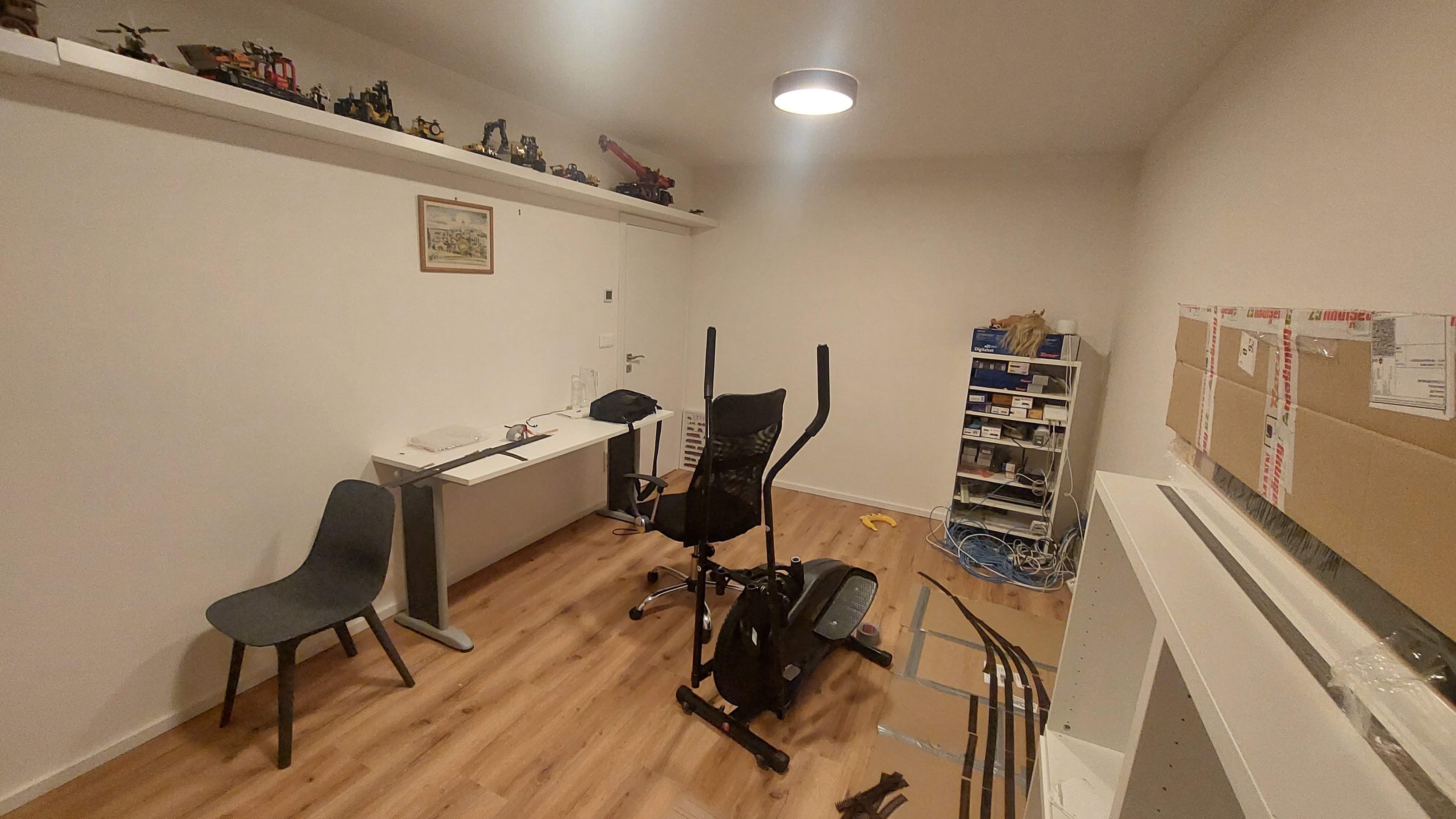 V místnosti nezůstane nic, jen oproti dveřím je vyvedená síťová kabeláž - někde pod kolejištěm by v těch místech měl být rack, router a wifina. Někde v místnosti by měl být stůl na práci s vláčkama a ovládání kolejiště. Rád bych se vyhnul nějakým montážním otvorům - celé kolejiště by mělo být dostupné "od krajů". A na zemi postupně skládám papundekl, abych si to dovedl nějak představit.