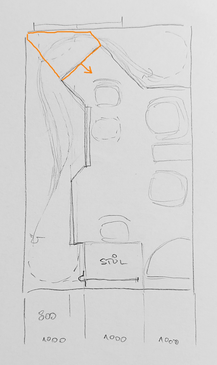 Co mě ale nejvíc trápí do začátku je využití toho prostoru. Zkoušel jsem si namalovat víc možností, ale nedokážu se rozhodnout: G kolem stěn, O včetně vyndávacího dílu, něco jako F nebo P... všechno se tam teoreticky vejde, ale taky tuším, že spousta nápadů je pitomost. Co by byla vaše volba?