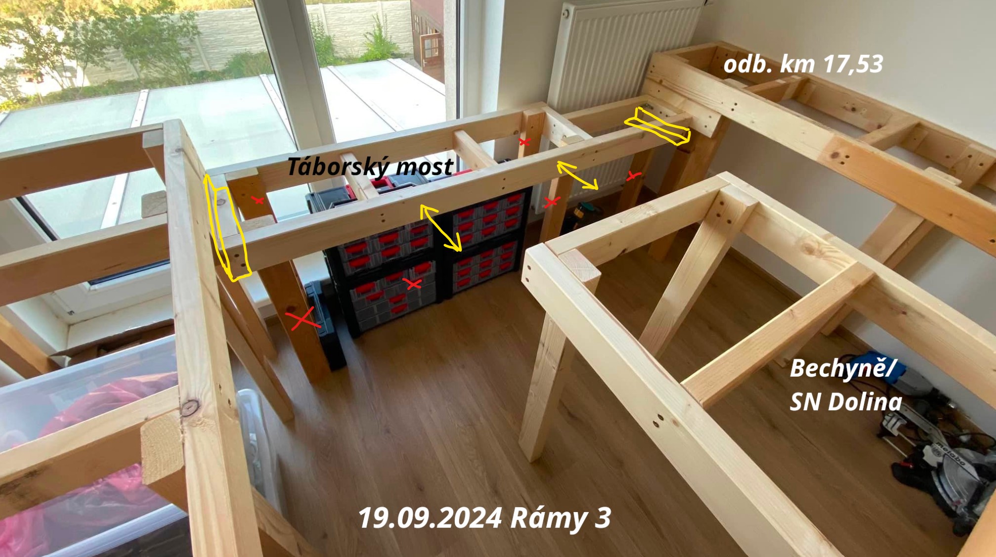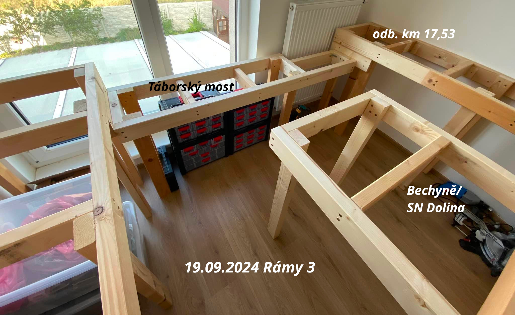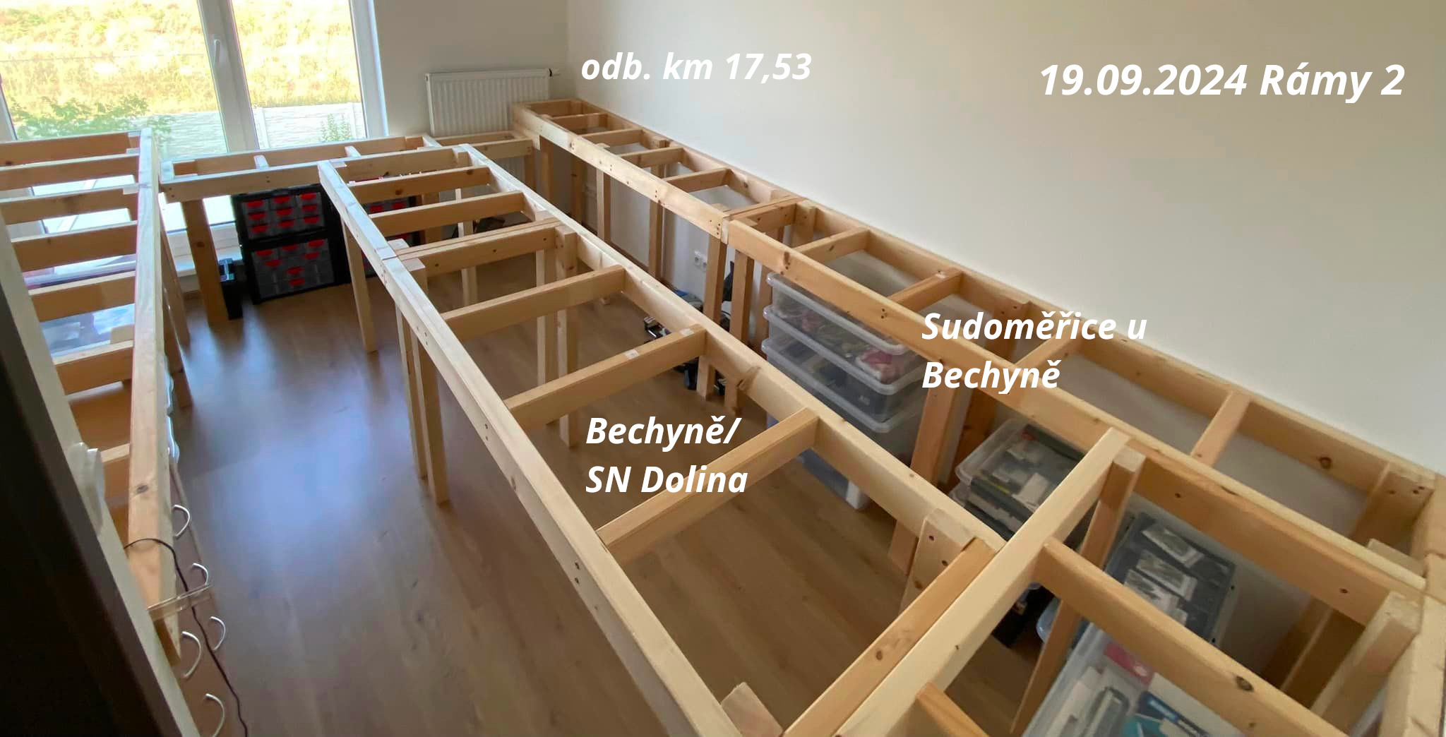 Pane kolego, dovolím si upozornit na fotku "Rámy 3", díl Táborský most. Tady je zásadní chyba v konstrukci s ohledem na údržbu. Když už máte dvě a dvě nohy na koncích stolů u zdi (proč?), využijte to a pro díl s mostem na ně dejte jen podpěru/kolejničku, aby se celý díl s mostem dal vysunout od okna a odnést ven z místnosti pro případ mytí okna nebo čehokoliv jiného. Díl s mostem taky nepotřebuje ty dvě nohy uprostřed, při téhle síle trámků by to uneslo chlapa. Kvůli té změti noh dole se nedostanete k oknu, blokuje to ukládání materiálu a zejména pak úklid pod kolejištěm. Taky bych nedával krabice před okno, nebude tam cirkulovat vzduch a okno se bude rosit (a plesnivět).
