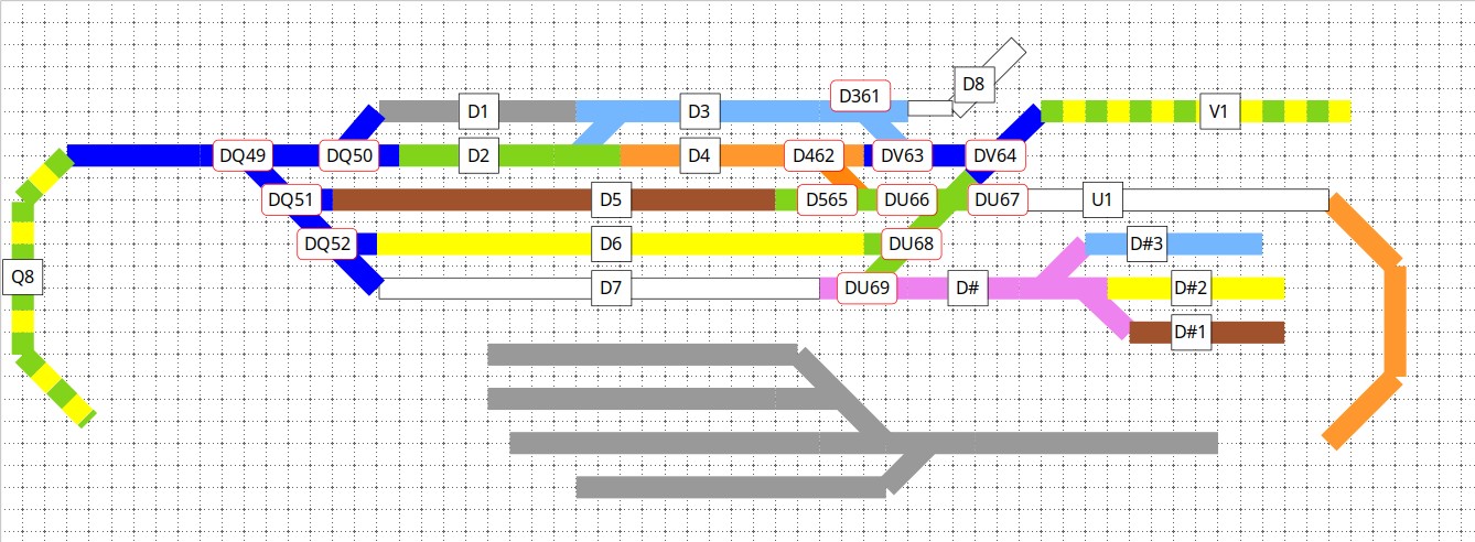 Pokud vozy odstavíš na 4, pak si je zde vyzvedne loko Mn a zajede s nimi na nějakou dopravní kolej a odjede. Jak asi víš, vlak nesmí odjet z manipulační koleje. A měla by se provést zkouška brzdy (asi stačí zjednodušená), takže po konci posunu by měl být chvilku klid. A jen malá poznámka, pokud modeluješ hlavně parní dobu, Ds je řazen za lokomotivou, aby osádka vozu v zimě nezmrzla, takže při posunu pendluje spolu s lokomotivou, odvěšuje se až za ním, topná spojka zůstává spojená. Takže pokud máš dostatečně dlouhé koleje, dej odpojovače tak, aby se ti mezi ně a návěstidlo vešla jak loko, tak Ds, ať nemusíš zbytečně popotahovat. Samozřejmě platí, že si můžeš dát těch rozpojovačů na jednu kolej i víc a při příjezdu si hned pohlídat, že zastavíš tak, aby jsi stál daným místem hned nad rozpojovačem. Ovšem ve skutečnosti už by například v koleji 2 žádné přechodové můstky nebyly.