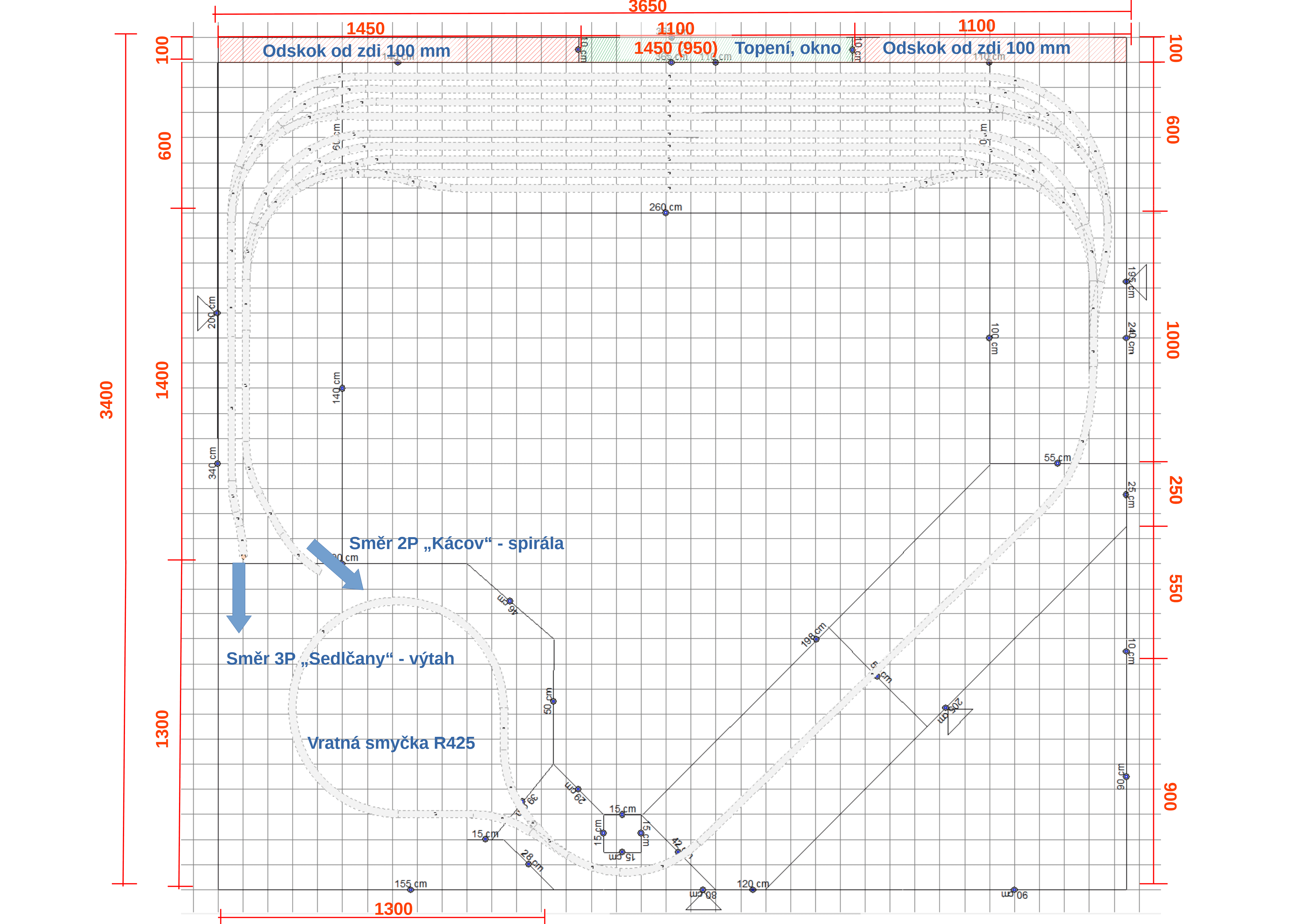 Místnost má rozměry 3700 x 3400 mm viz níže (ano vím, že TT, nebo dokonce N by se vešlo daleko lépe než H0, ale s tím do toho jdu