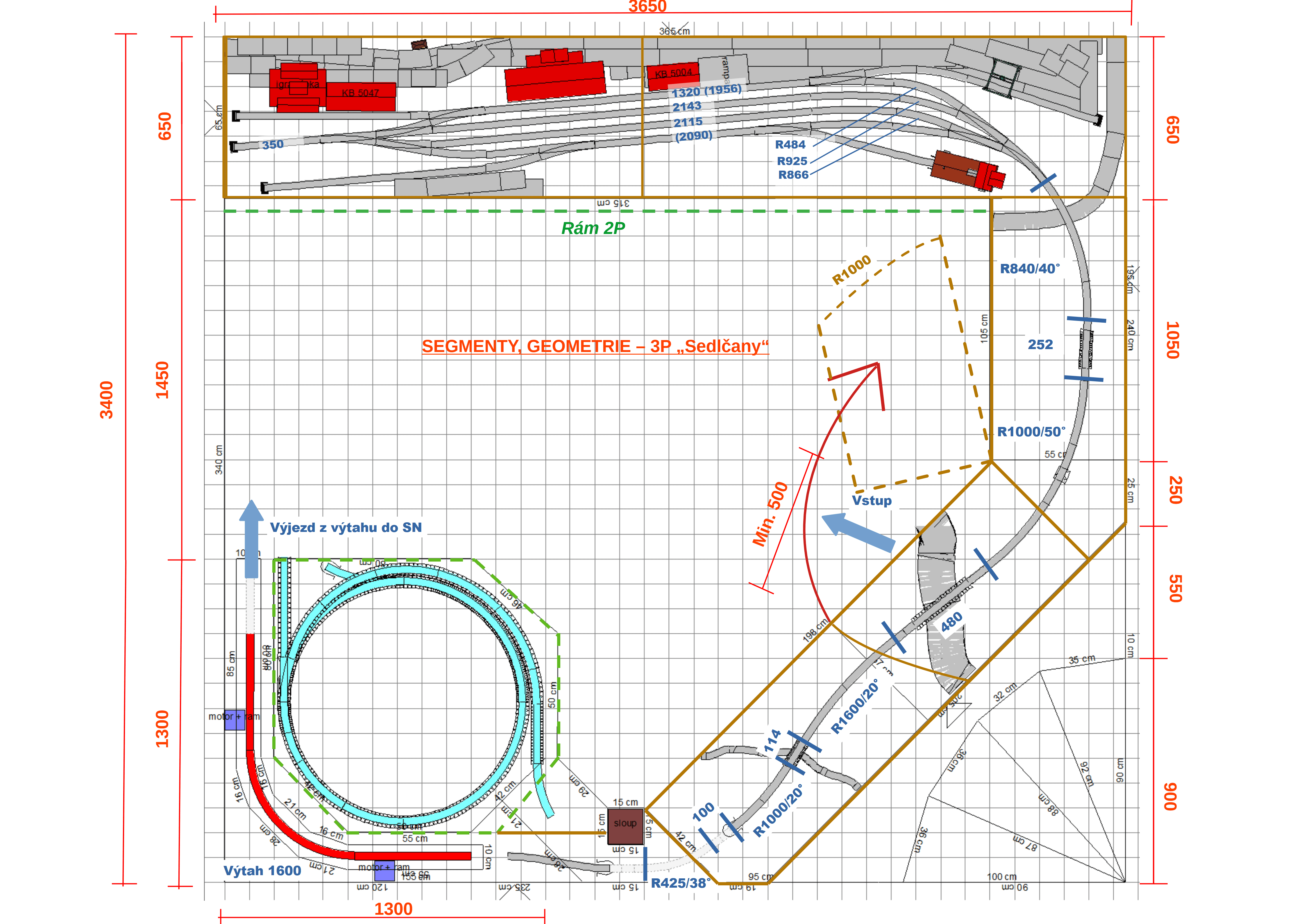 SN je zatím jen náčrt v pracovní verzi (např. některé výhybky jsou částečně přes dělení segmentů). Každé patro bude mít nejspíše vlastní SN. Pro 3P by mohly stačit 4 koleje, 3 pro odstavení souprav + 1 objízdná, pro 2P min. 5 kolejí + 1 objízdná. SN se vejde jak pod segmenty nádraží, tak pod segmenty u dveří. Vím, že velikost SN se odvíjí od provozu, nástin provozu je v dalších části. Dále chci do SN vložit vratnou smyčku pro otáčení souprav. SN by mohlo mít vlastní segmenty, které by měli jít v ideálním případě vyndat z celku zvlášť.