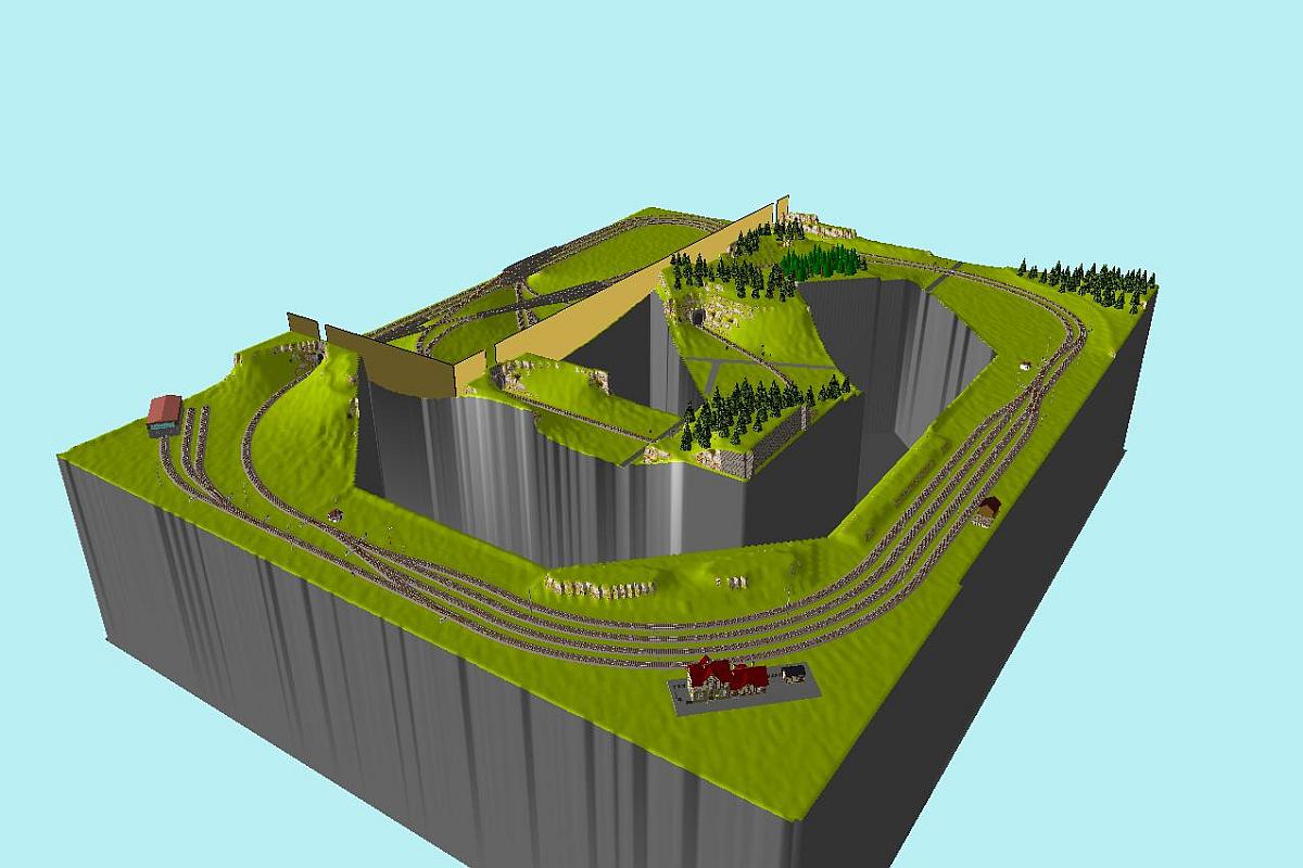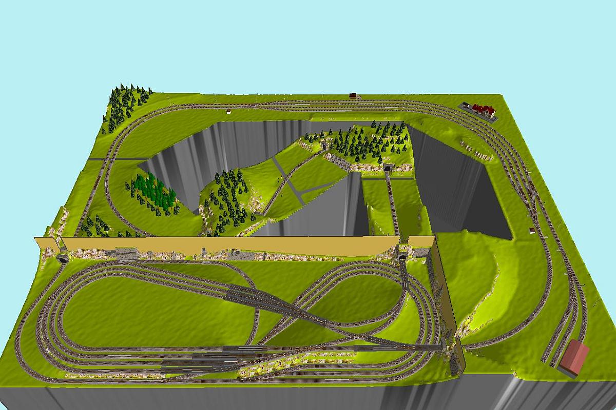 Prvotní návrh jsem si rozkreslil na čtverečkovaný papír 1:20, poté přišel na řadu WIntrack. :) Vzhledem k poněkud "megalomanskému" návrhu se na uvedenou plochu nevejde o mnoho víc, než odbočná stanice, simulující obdobné dopravny v síti ČSD s kusem hlavní tratě. Na jednom zhlaví vycházejí hlavní a odbočná trať, na druhém konci stanice by měla kromě hlavní tratě stát buď menší výtopna, původně sloužící vedlejší trati (nejspíš bez točny) nebo nakládka dřeva. Díry mezi moduly jsou tam proto, aby se dalo v případě potřeby dosáhnout, kam je potřeba a taky abych se tam vůbec vešel. :) Skryté nádraží je společné pro všechny 3 konce, s možností jízdy "odkudkoli-kamkoli".
