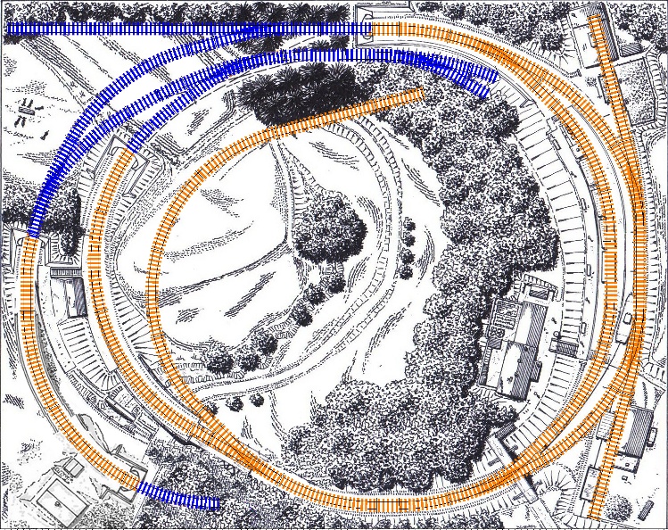 V noci jsem si pohrál s původním návrhem a zakomponoval do něj napojení dle Mrázova. Líbí se mi to zatím nejvíc. Sice jsem musel udělat malinkatý ústupek ve formě 7 centimetrů oblouku 267 (zcela vlevo uprostřed mezi výhybkami), ale snad se to vyplatilo.