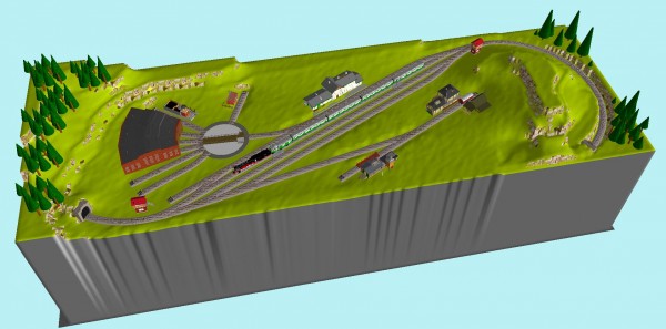 Zdar. Dovolím si jednu připomínku k parádnímu plánku kolegy Lajblta, Rotunda zakrývá celý levý oblouk trati, to mi připadá trochu škoda, hlavně pokud má kolejiště vyhovovat sledování vlaku. Spirálu v levo, bych protáhl aby klesala co nejvíc po obvodu segmentu, to umožní posunout točnu blíže ke stanici a otočit rotundu vratama ke stanici, odstavné koleje nebudou schované za rotundou ale před ní, zárověň tím dojde k odkrytí levého oblouku za stanicí, taky by možná šlo depo kolejově napojit i na druhé zhlaví stanice, zrychlí to obrat lokomotiv.