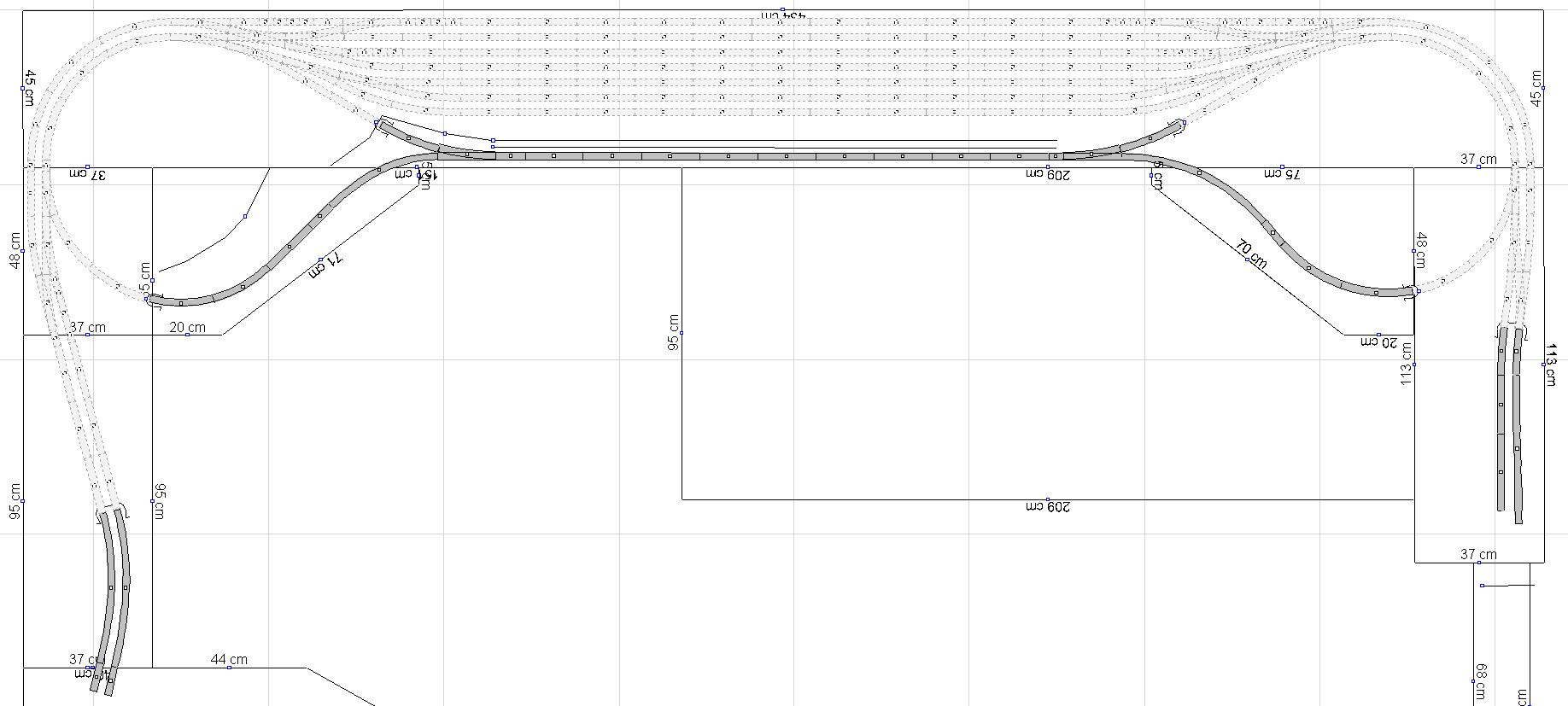 Jinak tomu provozně moc nerozumím - na první pohled to vypadá jako kombinace dvou okruhů a dvou falešných dvoukolejek (se společnými smyčkami vlevo nahoře), ale tím že SN je jen na jedné větvi, tak se do něj (a z něj) nemůžeš na mnoho kolejí dostat. Kdybys ten spletenec vlevo nahoře trochu poladil, dostal bys o dost víc provozních možností.