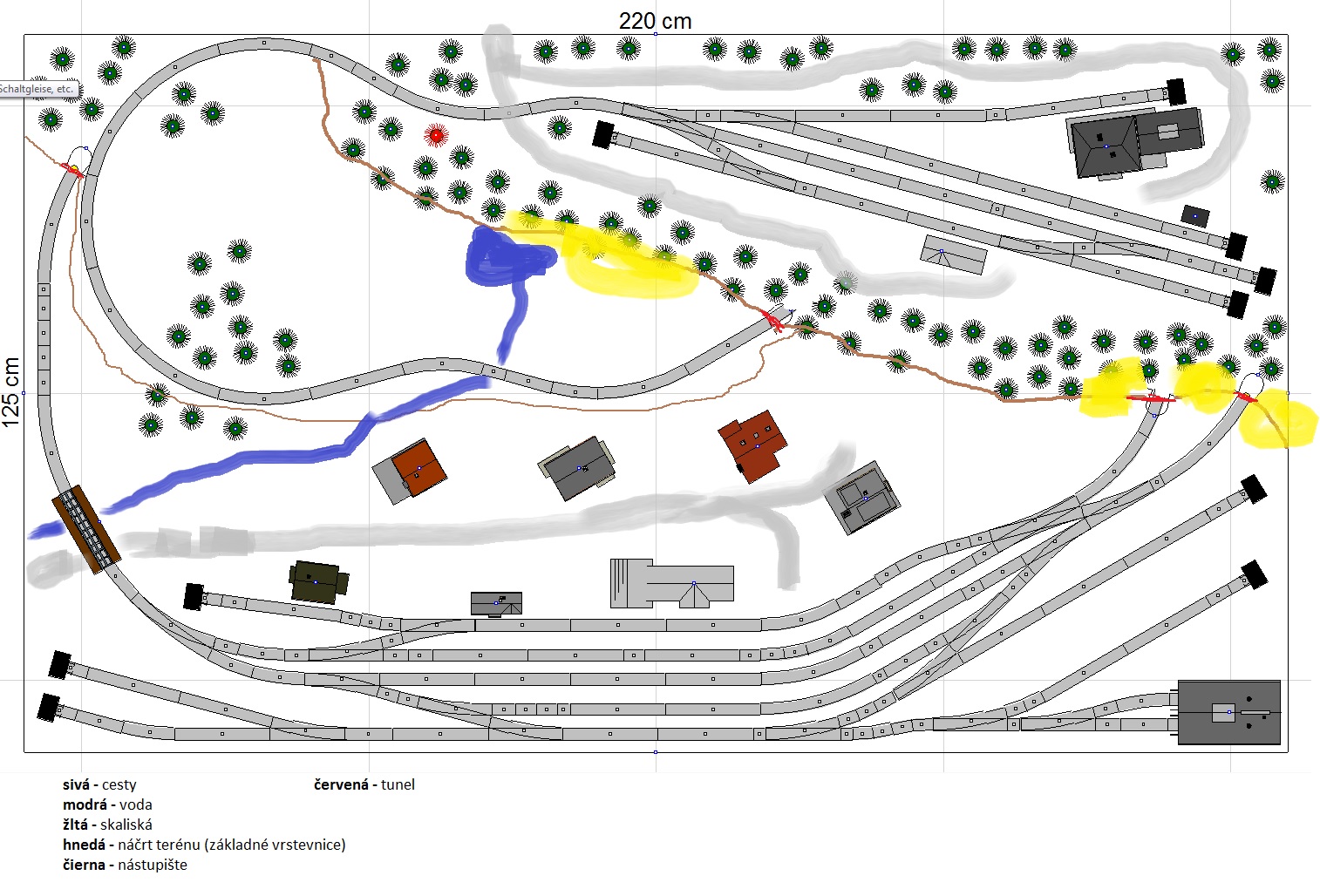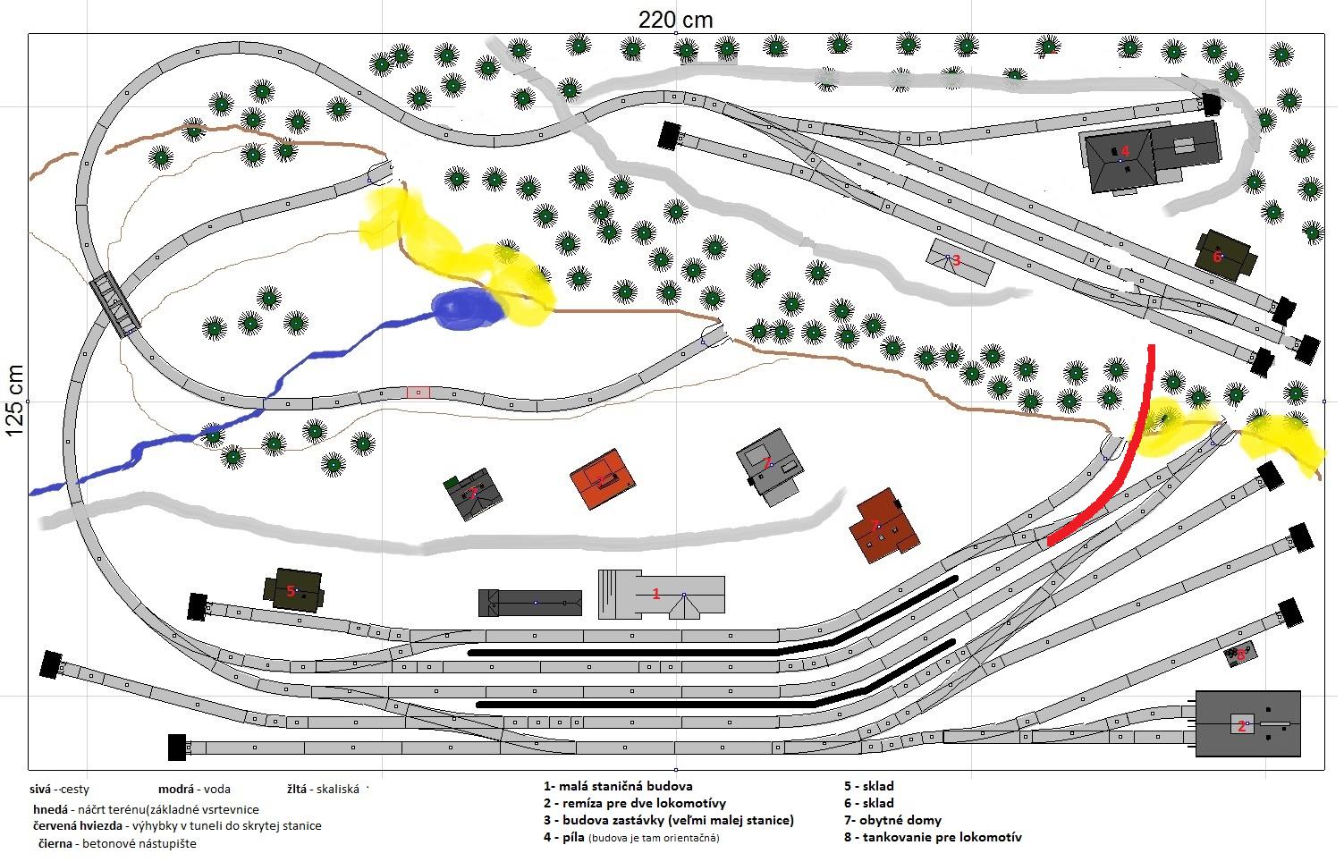 Pripájam moje nákresy (umiestnenie koľajiva som robil vo wintracku a následne som dokreslil ostatné veci v windovsáckom painte) s jednoduchou legendou.
