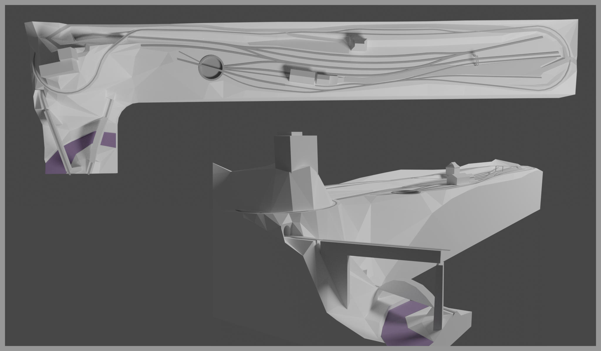 Vytvořil jsem si hrubou prostorovou skicu stanice. Omlouvám se za to ztvárnění, Wintrak nebo Scarm jsem zatím moc nepochytil :( Zápasím tam se skladištěm, to jsem tam umístnil neplánovaně, na poslední chvíli. Abych k němu z "úzkých" kolejí, mohl zatlačit vagon, asi by musela být někde druhá lokomotiva. Může to tak být, nebo je potřeba objízdná kolej? Chtěl jsem kolejový plán co nejjednodušší, no vychází mi z toho "Praha - Hlavní nádraží". Určitě je tam takových rozporů spousta- uvítal bych připomínky :) Pod zámkem jsem zrušil zářez a hlavní trať umístnil do tunelu. Nad ním je hřeben, zpoza kterého vyústí úzkorozchodná trať. Představuji si, že by vlak vjel pod povrch do skrytého nádraží otvorem zakrytým hustou vegetací. Aby bylo zřejmé, že trať pokačuje údolím vedle hřebenu. Je to tam takové kritické místo :( Vedle remízy by měla být taková ta nakládací rampa, kdy přes ni vjede "úzká" mašinka na vagon- á la Hronec. Ale spíš teď uvažuji o podvalníkové jámě.? Jak by se tam přes točnu tlačily vagony? Není zobrazené řešení hloupost?