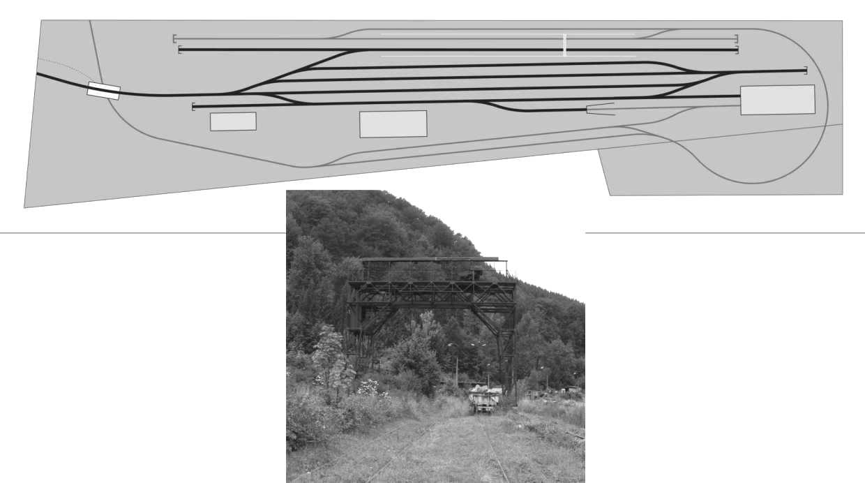 No, je to taká prapodivnosť. Najprv si treba ujasniť, čo má úzkokoľajka predstavovať, aký je tam tok tovarov. Ak by to bola iba nejaká " kalamitná" lesná železnica, v podstate by stačila ako stanica výhybňa s kusov koľajou pre prekládku dreva. Už sofistikovanejšie by bolo tam dať podvalníkovu jamu a prevádzkovať krátke vlaky na podvalníkoch. Asi by som zavrhol "obchvat" stanice a radšej urobil kríženie tratí na konci norm. rozchodu. Síce by sa na "druhu" stranu jazdilo cez úvrať, ale bolo by to také realistickejšie.