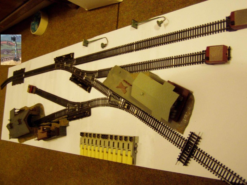 Ad navijáky, koně etc: Proto plánuju ukončit kolej vpravo dole, tj nejdál od kulisy jen pražcem přes koleje a hromadou štěrku, za ní kolej bude pokračovat patinovaná, zarostlá, existující leč nepoužívaná, což by jako naznačovalo že se jedná pouze o výsek z vetšího vlečkového areálu ač zašlého. Každopádně z logiky inglenooku jako posunovacího hlavolamu je ukončení koleje nutností, na fotce je délka naznačena položenou kolejí napříč, šturc nebude, takže kolej původně pokračovala dál do vlečky mimo panel, úvraťovou se stala po "krachu fabriky"
