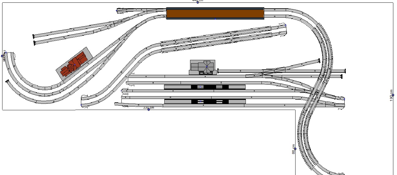 Pak jsem si popřemýšlel jak to vyřešit a první mě napadlo zda by se Ti nelíbilo řešení, kde budeš mít "polovinu" viditelného nádraží skrytou a nahrazenou kulisou. Viditelné bude pouze jedno zhlaví, a začátek peronů. Pak koleje zmizí, v nádražní hale a následně ve skryté smyčce. Podobné řešení jsem navrhoval Mírovi Lengyelovi http://diskuze.modely.biz/viewtopic.php?f=1&t=3676&start=30.