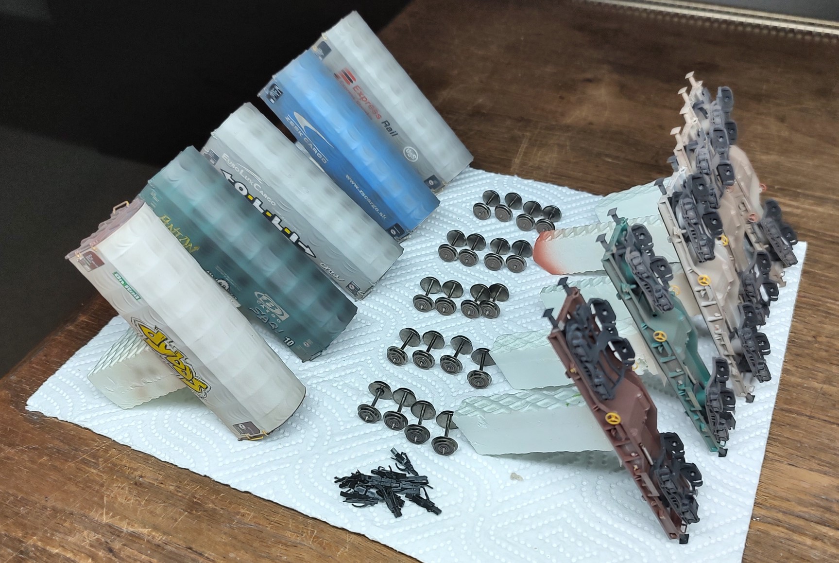4) Rám a podvozky stříknu barvou UA719 Frame Dirt (rámová špína), opět podle fotek. Tou samou barvou udělám spodní části čel vozů, spodek bočnic a víc toho vytáhnu na bočnicích okolo konců vozů, kde kolejová špína víří. Vezmu i dvojkolí, případně o něco tmavějším odstínem. Nechám zaschnout.