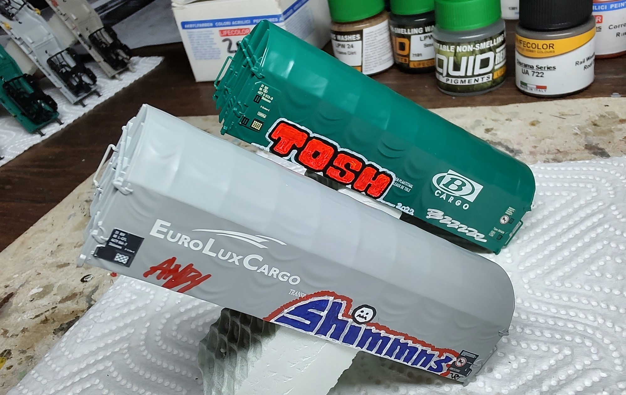 3) Pak barvou UA722 Roof Dirt (střešní špína) vezmu zase prášením celý vůz, opatrně! Následně dělám pistolí pruhy napříč v místě prověšených plachet, napřed nahoře, pak na boku a jemně dostříknu prohlubně, kde má plachta záhyby. Opravdové vozy mají o hodně víc zašpiněné krajové segmenty, které se neshrnují. Tou samou barvou vezmu čela, ale spíše jen vrchy s přechodem do vytracena. Cedule s označením překryju maskovací páskou a pak v průběhu lakování odkryju, abych znázornil, že jsou špinavé jen trochu. Některé vozy mají staré cedule a novou plachtu, takže vyšisovat ceduli a trochu víc ji přišpinit, pak až dělat zbytek.