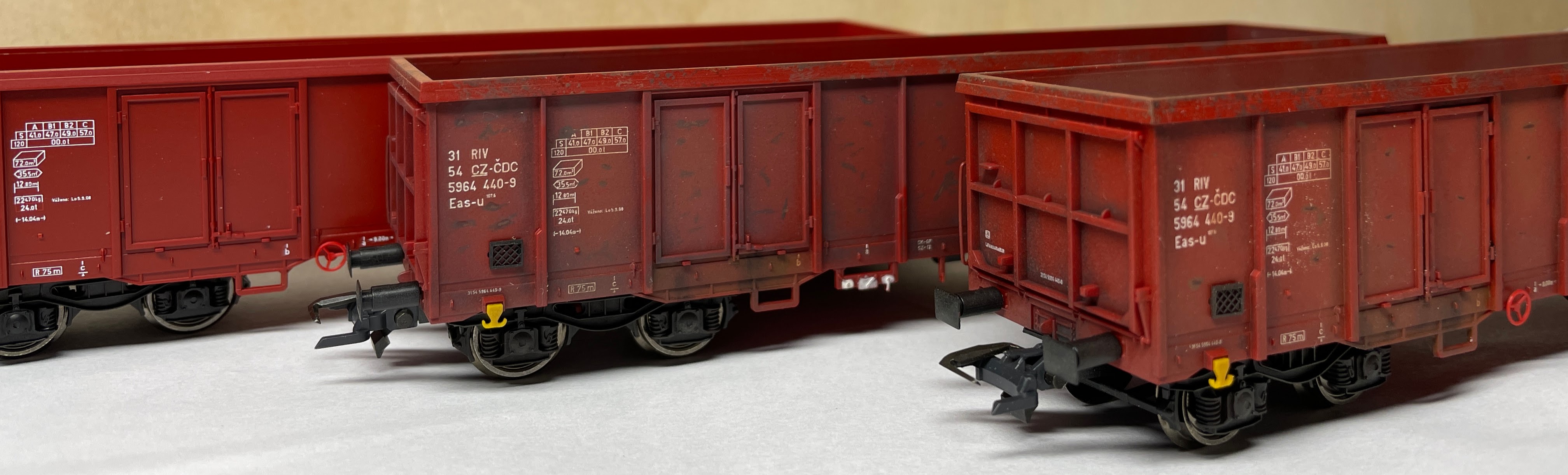 Používám sadu barev CS21 RAIL WEATHERING, washe TSC02 TENSOCROM ACTIVE SURFACE AGENTS SET2 a pigmenty ze sady LIQUID LIGMENTS LP05 TRAINS & TRACKS plus dále popsané čiré laky.